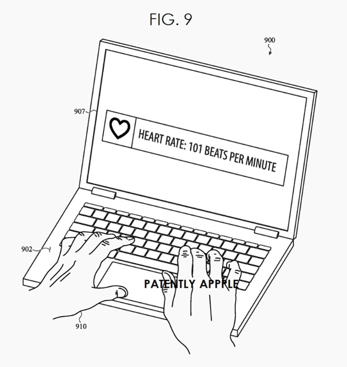 Il bio-sensore indicato nel brevetto di Apple può essere collocato vicino alla tastiera, nella zona dove si poggia uno dei polsi della mano. Il sistema prevede uno strato trasparente da collocare in un’area del case adiacente al trackpad; il sensore produce una emissione luminosa trasmessa attraverso micro-perforazioni; quelli che sembrano probabilmente fotodiodi sensibili alla luce permettono di rilevare vari parametri quali ad esempio la frequenza cardiaca, il flusso sanguigno, il tenore idrico e altro ancora e – usando un app per il monitoraggio – indicare potenziali condizioni legate alla salute, quali ad esempio l’ipertensione.