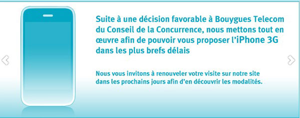 Da notare che Bouygues non fornisce ancora un prezzo per i terminali, sicuramente perchè Apple non le ha ancora dato il via libera per la vendita. Probabilmente non ha ancora avuto luce verde neppure per l’utilizzo delle immagini di iPhone da Apple tanto che pubblica una sorta di silhouette degli iPhone per pubblicizzare la sua iniziativa.
