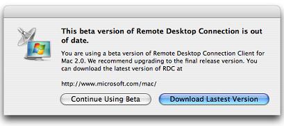 Il messaggio appare essendo stata la versione beta 2 di Microsoft Remote Desktop Connection rilasciata ad ottobre dello scorso anno; sono, dunque, passati cinque mesi. Il messaggio che appare sullo schermo era stato evidentemente preparato dalla casa di Redmond con la certezza che nei mesi a venire sarebbe stata approntata la nuova versione. Purtroppo così non è stato. L’applicativo (gratuito) è ad ogni modo molto stabile ed è possibile continuare ad usarlo facendo click sul pulsante “Continue using Beta” che appare nella finestra di dialogo proposta al primo avvio dell’applicazione.