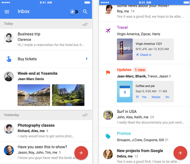 Tra le principali differenze rispetto ai classici client di posta, Inbox suddivide i messaggi in differenti tab, assegnando a ciascuno una differente etichetta: posta primaria, gli aggiornamenti dai social network, le promozioni e le offerte, e gli aggiornamenti e le notifiche per acquisti o ricevute. I messaggi saranno automaticamente archiviati in base alla loro natura e sarà possibile creare filtri personalizzati per poter sfruttare la divisione della posta in arrivo così presentata. Da oggi, non solo l’app è accessibile all’utenza senza necessità di inviti, ma vengono aggiunte numerose funzionalità, che servono a rendere ancora più smart l’applicativo.