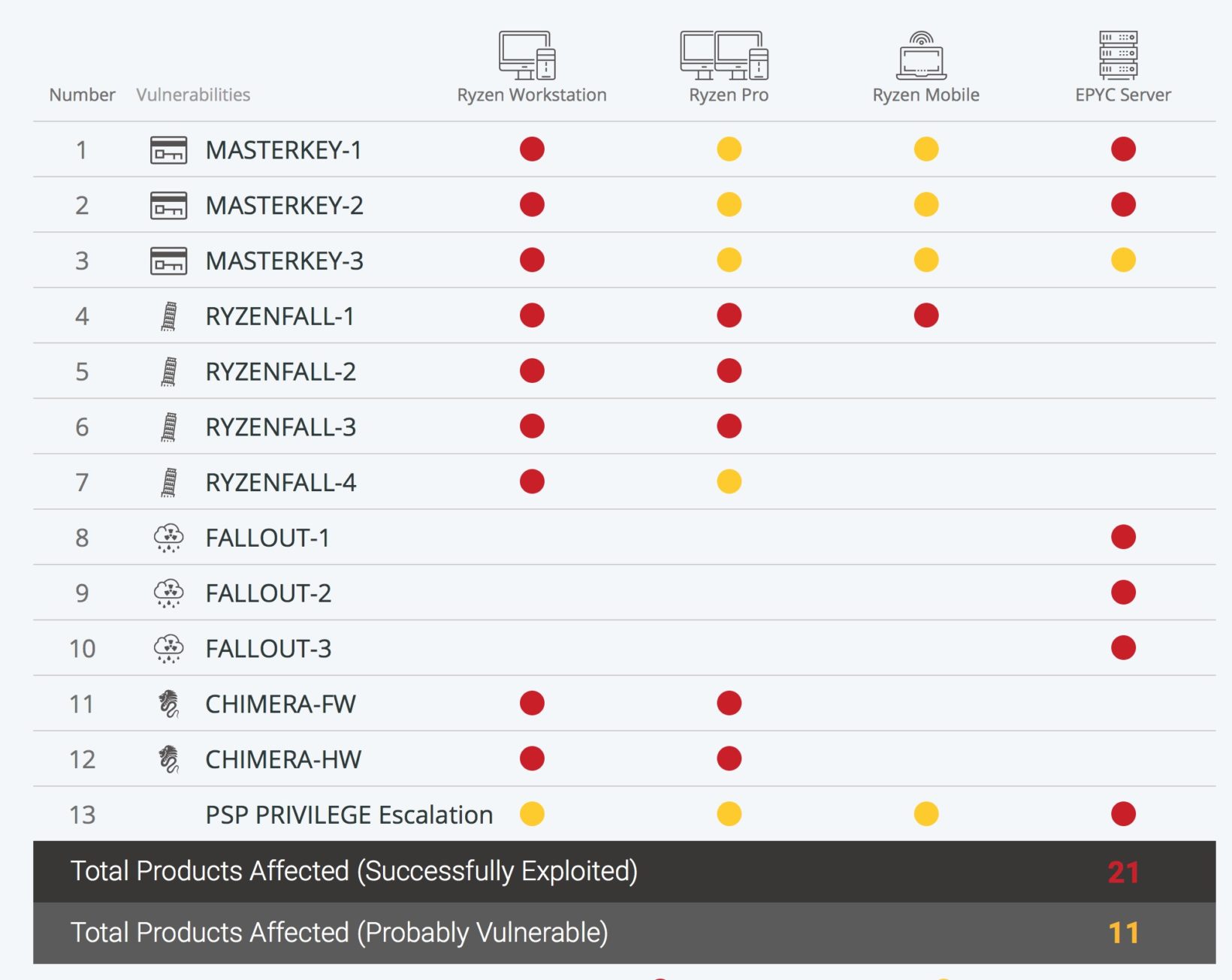 Alle varie vulnerabilità sono stati assegnati i seguenti nomi: Ryzenfall, MasterKey, Fallout e Chimera. La classe di vulnerabilità indicata come “MasterKey“, ha tre varianti ed è presente in tutti i processori indicati; permette l’esecuzione di codice arbitrario nel Secure Processor ma richiede il del BIOS, un aggiornamento per attaccare il chip ARM Cortex M5 (il “cuore” del Secure Processor). Secondo CTS-Labs, American Megatrends (azienda che fornisce BIOS per vari sistemi) rende per default la riprogrammazione del BIOS molto facile. Per proteggersi dovrebbe bastare impedire aggiornamenti non autorizzati del BIOS anche se una diversa falla denominata “Ryzenfall” forse consente di superare anche i meccanismi di protezione del BIOS.