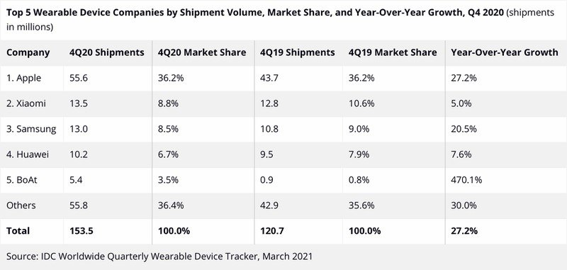 Secondo IDC, in tutto il 2020 Apple ha spedito 151,4 milioni di dispositivi indossabili, con il 34,1% di market share. Xiaomi si colloca al secondo posto nella classifica dei vendor di dispositivi di questo tipo per il 2020 con 50,7 milioni di unità spedite; seguono Huawei e Samsung con, rispettivamente, 43,5 milioni e 40 milioni di unità.
