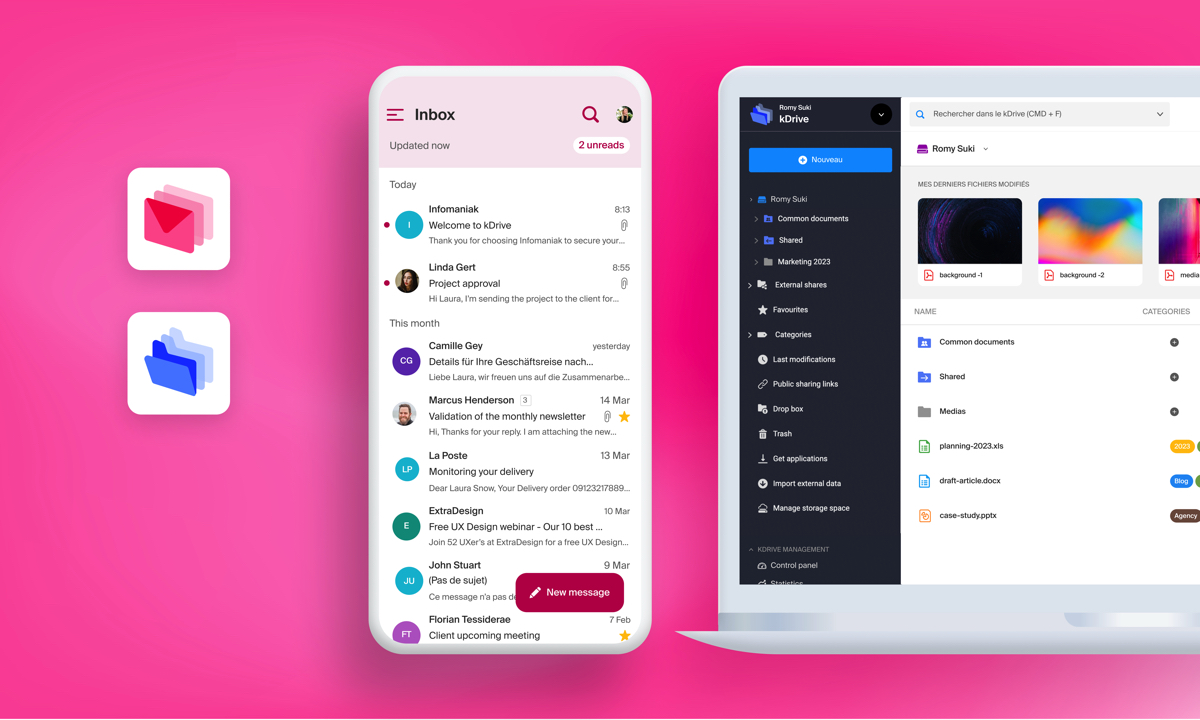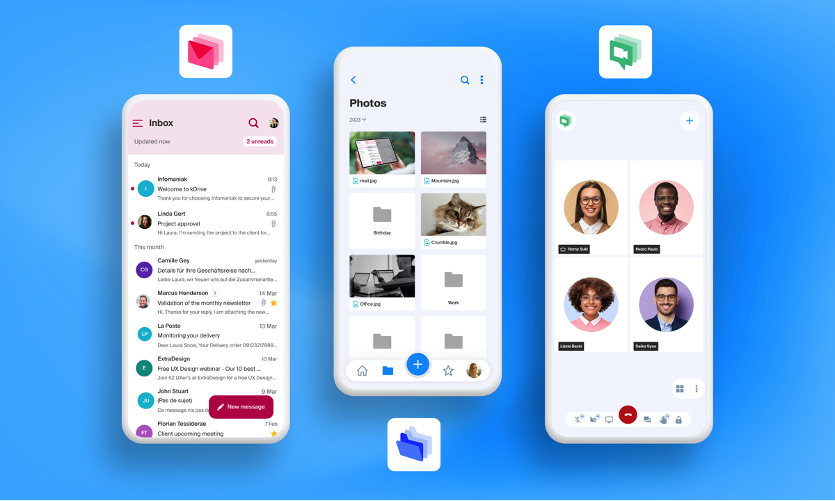 La società offre anche ben 15GB di spazio di archiviazione aggiuntivi sempre gratuiti con kDrive, sevizio cloud per archiviare e sincronizzare file tra tutti i dispositivi dell’utente. Offre anche creazione e collaborazione online sui documenti Word, Excel e PowerPoint, importazione automatica da Google Drive, Dropbox, One Drive, NextCloud e WebDav, sempre con datacenter tutti ubicati in Svizzera e gestiti da Infomaniak.