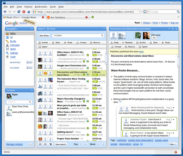 Google Wave è arrivato, adesso, e in molti stanno apprezzando le possibilità che offre anche se non tutti capiscono fino in fondo di fronte a che cosa si trovano. Lo strumento di collaborazione crea nuove metafore, che per l’informatica sono fondamentali, e al tempo stesso richiede come requisito necessario da parte delle persone una serie di bisogni – non ultimo quello di avere altri soggetti a distanza con cui collaborare a progetti – che non tutti hanno. Ma per chi li ha, dice la rete, Google Wave pare funzionare già adesso molto bene. Vedremo più avanti quando useremo l’invito arrivato anche al vostro cronista.