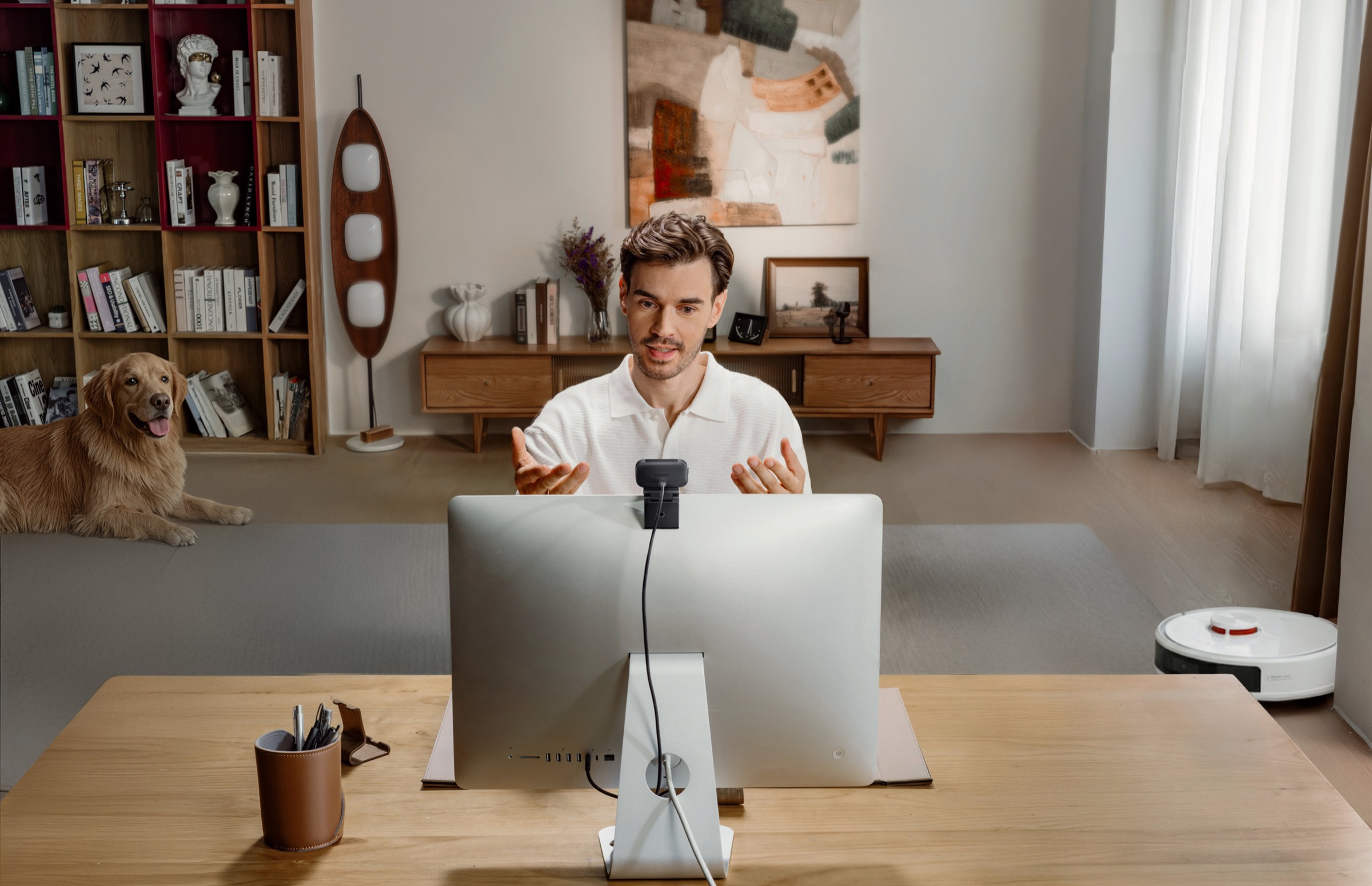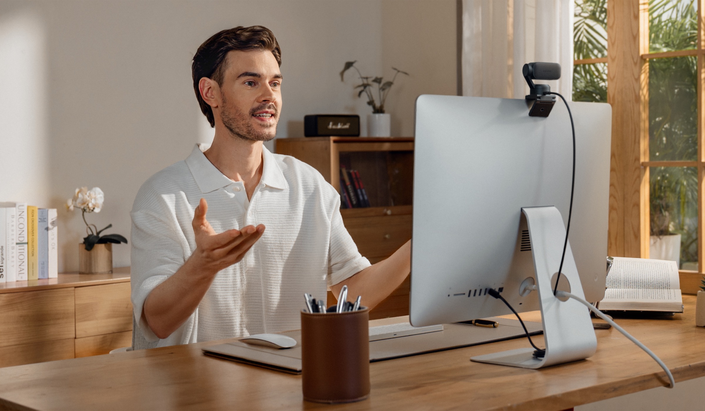La 2C Pro è pensata per chi utilizza principalmente la webcam da una posizione fissa e preferisce un dispositivo più piccolo e semplice da collocare. Adotta infatti una struttura statica, senza parti meccaniche mobili, e l’inquadratura automatica (Auto Framing) viene gestita via software con l’intelligenza artificiale, che riduce digitalmente l’inquadratura per mantenere il soggetto centrato.