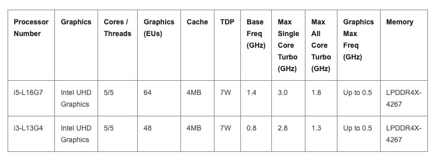 Sul versante connettività abbiamo il supporto delle soluzioni Intel Wi-Fi 6 (Gig+) e Intel LTE. Intel offre due variante, un Core i3-L13G4 e un Core i5-L16G7 con un TDP da 7 watt. Questi chip si basano su un core Sunny Cove con processo produttivo a 10 nm e quattro core Tremont per le attività in background. Sono in grado di supportare Windows nella variante a 32 e 64 bit.