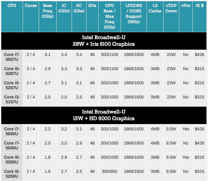 AnandTech spiega che i nuovi Broadwell-U sono disponibili in quattro varianti da 28-watt con un range di frequenze che varia da 2.5 GHz a 3.1 GH z e con integrata la grafica Iris 6100. I chip Core i5-5257U, Core i5-5287U e Core i7-5557U sembrano update degli Haswell-U che in questo momento sono usati sui MacBook Pro Retina da 13″. Per i vari modelli c’è un incremento della frequenza di 100 MHz rispetto alle controparti Haswell ma altre migliorie si trovano nel comparto grafico e dovrebbero permettere di ottenere prestazioni migliori.