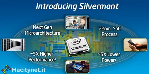 Dopo aver nominato un nuovo CEO e un nuovo Presidente, Intel ha fornito ulteriori dettagli sulla prossima generazione di Atom, CPU x86 a basso consumo che dovremmo vedere prima della fine dell’anno. Costruiti con un processo produttivo a 22nm, le nuove CPU con architettura denominata “Silvermont” sfruttano la tecnologia TriGate (fino adesso riservata ai processori desktop) e sono le prime a offrire prestazioni e consumi paragonabili ai recenti SoC di ARM. I chip sono ovviamente a 64 bit, integrano una modalità Turbo migliorata, nuove tecnologie di risparmio energetico, funzionalità di virtualizzazione. Il sistema multi-core offre una gestione scalabile dell’architettura (fino a otto core) permettendo di ottenere maggiori prestazioni, bassa latenza e supporto out-of-order (possibilità di riordinare le istruzioni non necessariamente nell’ordine definito dai compilatori).