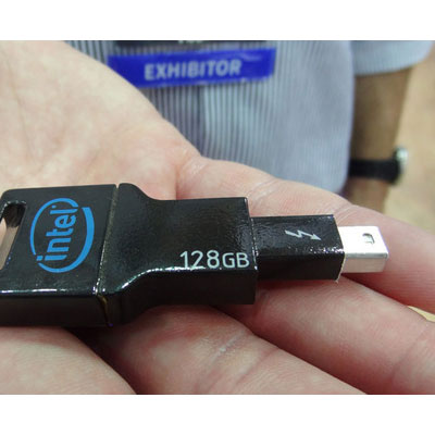Non è bellissima da vedere ma al Computex di Taipei Intel ha mostrato il prototipo di una chiavetta per l’archiviazione dati con connettore Thunderbolt. L’unità flash in questione è ovviamente molto più veloce delle soluzioni classiche USB 2.0 e 3.0 ed è disponibile al momento nel solo “taglio” da 128GB (all’interno integra una memoria flash di SanDisk). La casa di Santa Clara non ha fornito altri dettagli: il prototipo è al momento solo un riferimento che Intel proporrà ai costruttori per realizzare modelli che arriveranno in futuro.