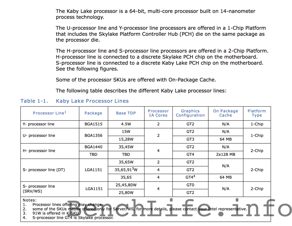 Il TDP (specifiche di progettazione termica) partirà da 4,5 watt fino ad arrivare a 91 watt. Quest’ultimo valore dovrebbe essere quello di riferimento per uno o più processori quad-core Core-i7 sbloccati (con supporto overclock) destinati a macchine desktop. Sembra in ogni caso confermata la compatibilità con le piattaforme LGA 1151, socket che sarà introdotto con Skylake e i chipset della serie 100. La piattaforma supporterà memorie DDR4 e il collegamento DMI 3.0 tra CPU e chipset.