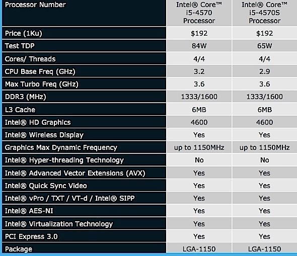 Le CPU sono identificate da Intel come “Core di quarta generazione”; la tecnologia produttiva rimane a 22 nanometri ma vi sono evoluzioni importanti nel campo delle GPU integrate, con differenti versioni secondo la tipologia di processore. Sul mercato arriveranno modelli Core i7 e Core i5 quad-core con velocità di clock che variano da un minimo di 2Ghz a un massimo (modalità Turbo) di 3.9Ghz. La cache L3 varia da un minimo di 4MB a 8MB; il TDP da 35W a 84W. I modelli in questione sono utilizzabili su schede madri con socket 1150 LGA; i prezzi variano dai 192$ (Core i5 d’ingresso) ai 399$ (Core i7-4770K con moltiplicatore di clock sbloccato al pari del Core i5-4670K). Con la sola eccezione del Core I7-4770R, tutte le CPU integrano la GPU Intel HD 4600 (la prima integra la Iris Pro 5200).