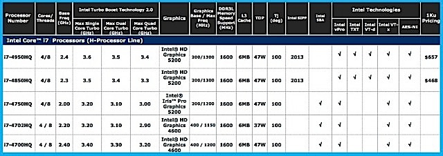 I chip destinati a macchine desktop, saranno disponibili in sei varianti Core i5, tutte quad-core e capaci di eseguire quattro thread in parallelo. Le varianti per laptop sono Core i7 quad core e offrono otto thread in parallelo. Una della famiglia è caratterizzata dalla lettera M e comprende modelli con GPU Intel HD 4600 (la stessa per i modelli desktop) e un’altra dalla lettera H che si differenzia per l’utilizzo della GPU Iris Pro 5200 con prestazioni superiori rispetto alla HD 4600.