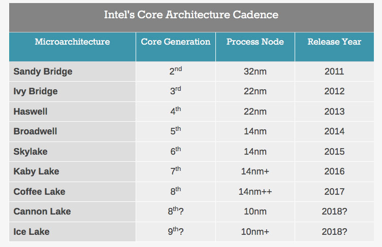 Anche per le prossime CPU Coffee Lake che saranno presentate il 21 agosto, Intel impiegherà ancora la tecnologia produttiva a 14 nanometri, indicata come 14nm++, quindi un ulteriore processo di miglioramento e ottimizzazione degli Skylake, ma l’azienda ha deciso diminuire le soluzioni dual-core concentrandosi su architetture quad o sei-core nei modelli di punta. Ma mentre finora la maggior parte delle famiglie di processori includeva modelli sia per notebook che per desktop, ora sembra di capire che Cannon Lake, i primissimi chip Intel a 10 nanometri potrebbero arrivare solo nella versione per computer portatili, mentre i modelli per computer desktop potrebbero arrivare solo in un secondo tempo con la generazione Ice Lake a 10nm+.