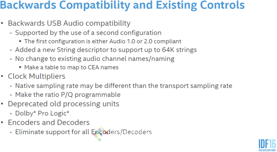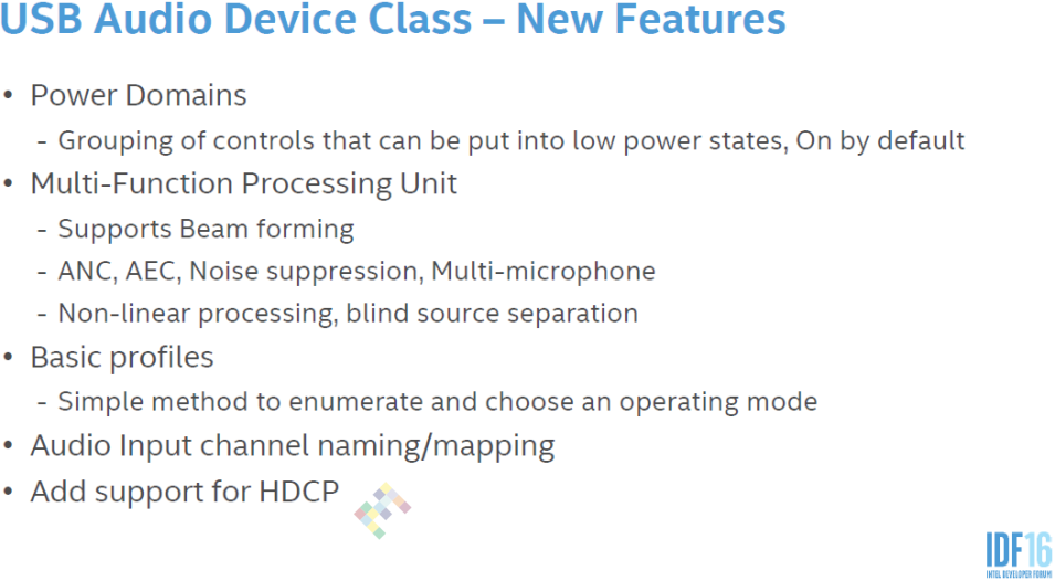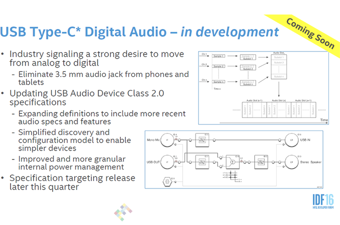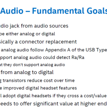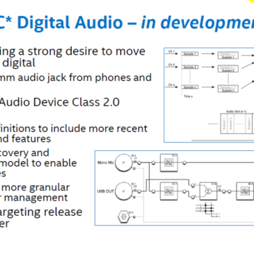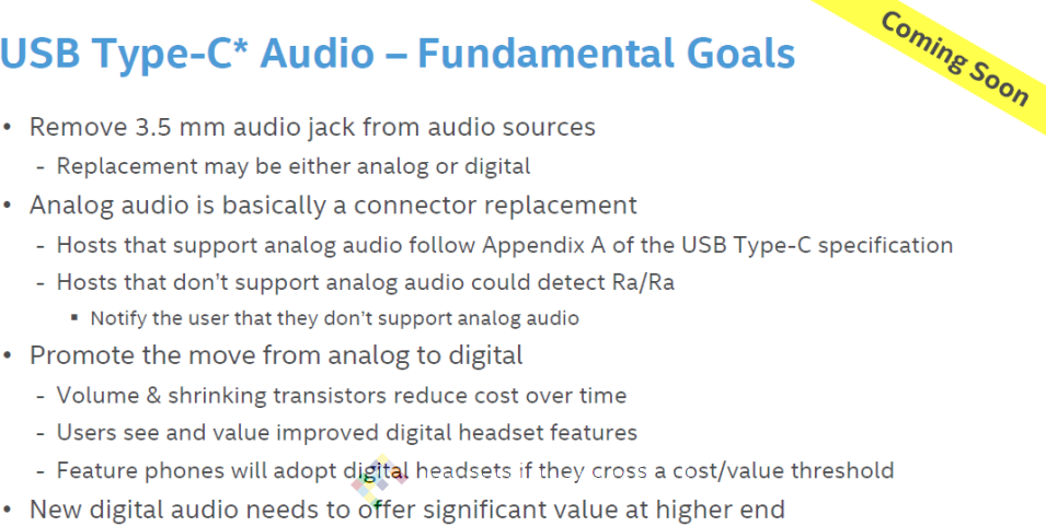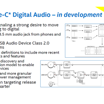 Già nel 2015 nel corso dell’annuale Developer Forum, Intel aveva annunciato la propria collaborazione con l’USB Implementers Forum, l’organizzazione che promuove lo standard USB, per lo sviluppo di un protocollo USB per il trasporto dell’audio con l’obiettivo di far nascere uno standard che permetta di creare cuffie USB-C.