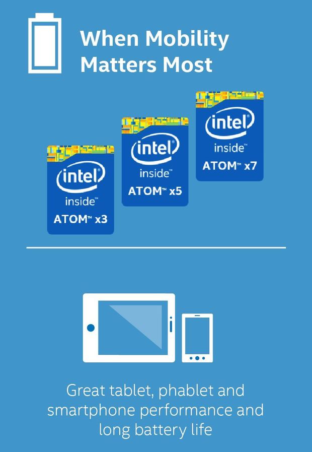 Intel rinominerà i processori Atom per rendere più semplice la loro identificazione e semplificare le attività di marketing. Tre le fasce previste: Atom x3 (per tablet, phablet e smartphone entry-level), x5 (a metà tra i modelli più prestanti e gli x3) e x7 (per i dispositivi top di gamma e più prestanti). L’azienda di Santa Clara ha voluto abbandonare la vecchia nomenclatura per adottarne una nuova, simile ai chip Intel Core (Haswell o Broadwell). Informazioni più dettagliate dovrebbero essere rese note nel corso del MWC 2015, evento durante il quale Intel terrà una conferenza stampa.