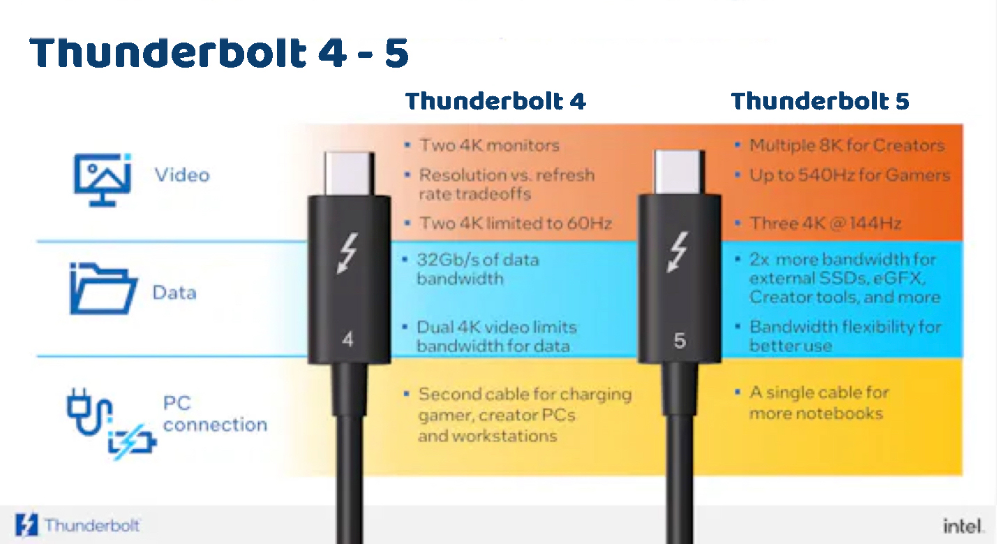 Mentre l’attuale Thunderbolt 4 è una versione migliorata di quella precedente, la quinta generazione costituisce un importante salto in avanti sotto ogni punto di vista. Le specifiche sono basate su USB4 v2 ma Intel richiede di serie requisiti di fascia top. La velocità base è così di 80 Gbps bidirezionale con indirizzamento PCI-E 4, il doppio dei 40 Gbps attuali con indirizzamento PCI-E 3-