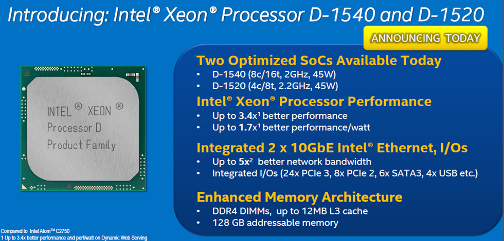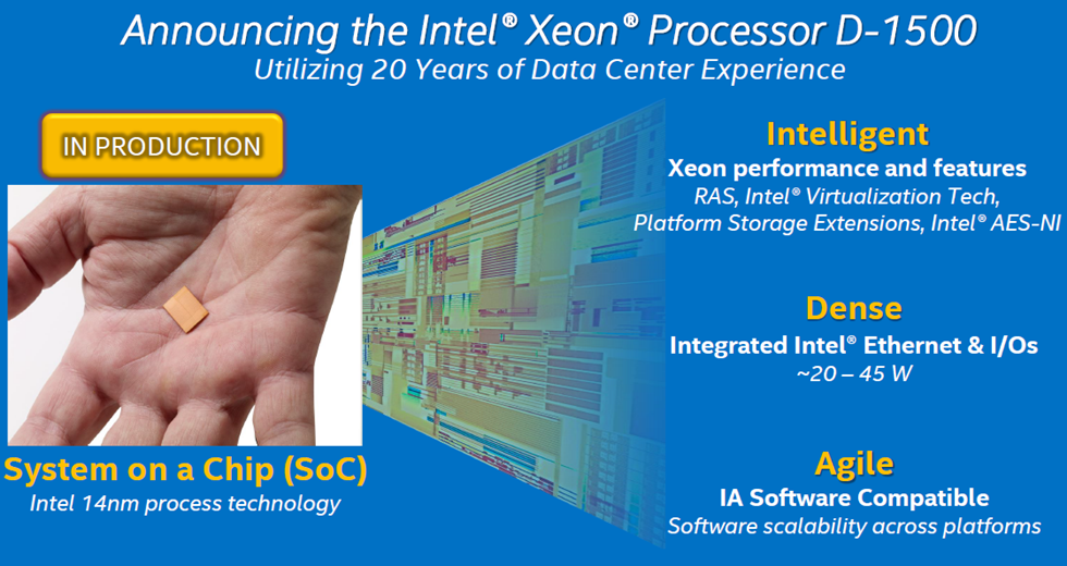 Intel ha annunciato la famiglia di processori Xeon D, il primo System-on-Chip (SoC) basato su processore Xeon. Realizzata con la tecnologia di processo a 14 nm, la nuova famiglia di processori combina le prestazioni e le funzionalità dei processori Xeon con le dimensioni e i risparmi energetici di un SoC.