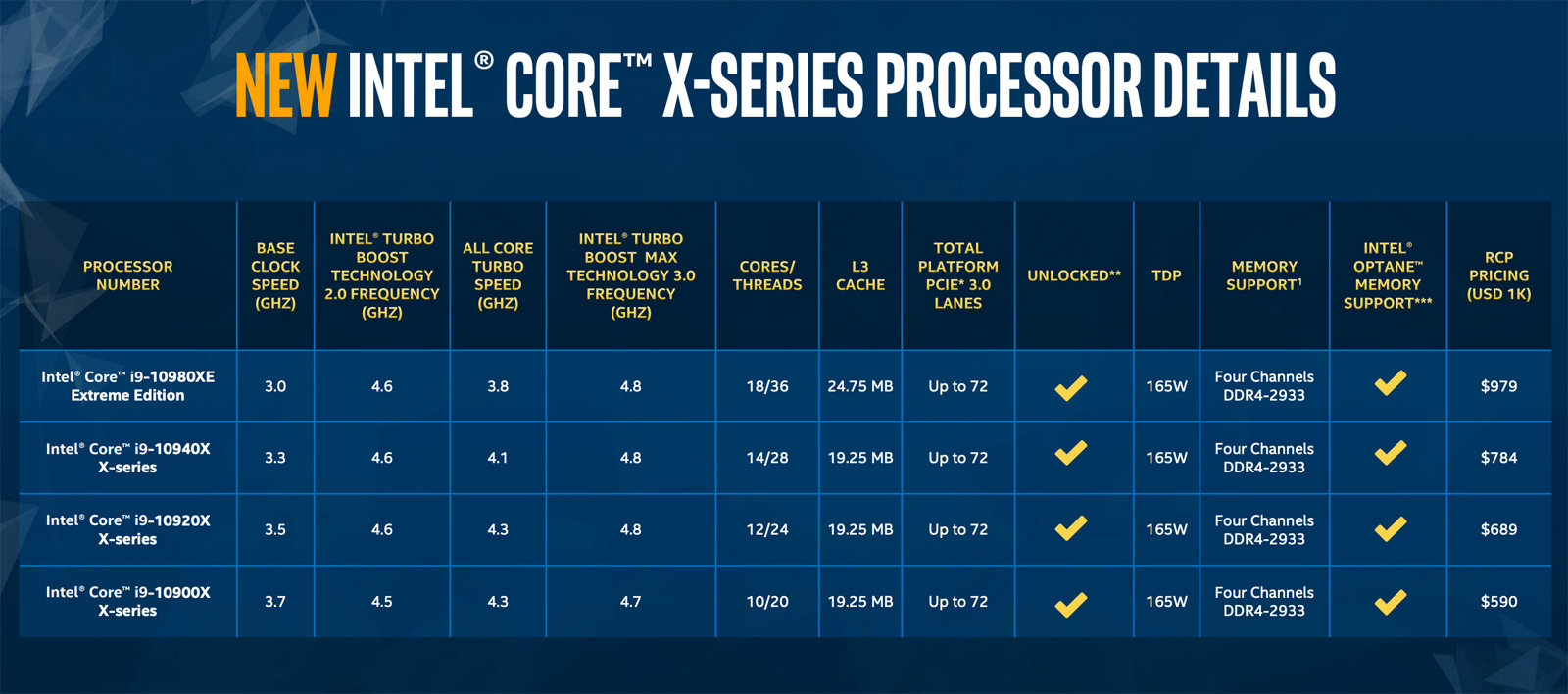 Per i liberi professionisti, i prosumer e gli utenti appassionati di computer desktop, con necessità diverse dalle soluzioni aziendali, il produttore propone i processori Intel Core serie X, promettendo “prestazioni elevate unitamente alla flessibilità aggiuntiva della capacità di overclocking”. Questi quattro nuovi processori (i9-10980XE, i9-10940X, i9-10920X e i9-10900X) sono adatti per flussi di lavoro avanzati nell’ambito dell’editing di foto/video, sviluppo di videogame e animazioni 3D. Per gli smanettoni, sono disponibili funzioni che consentono la regolazione personalizzata dei processore: sbloccati in modo dinamico in base “al DNA” prestazionale specifico della serie.