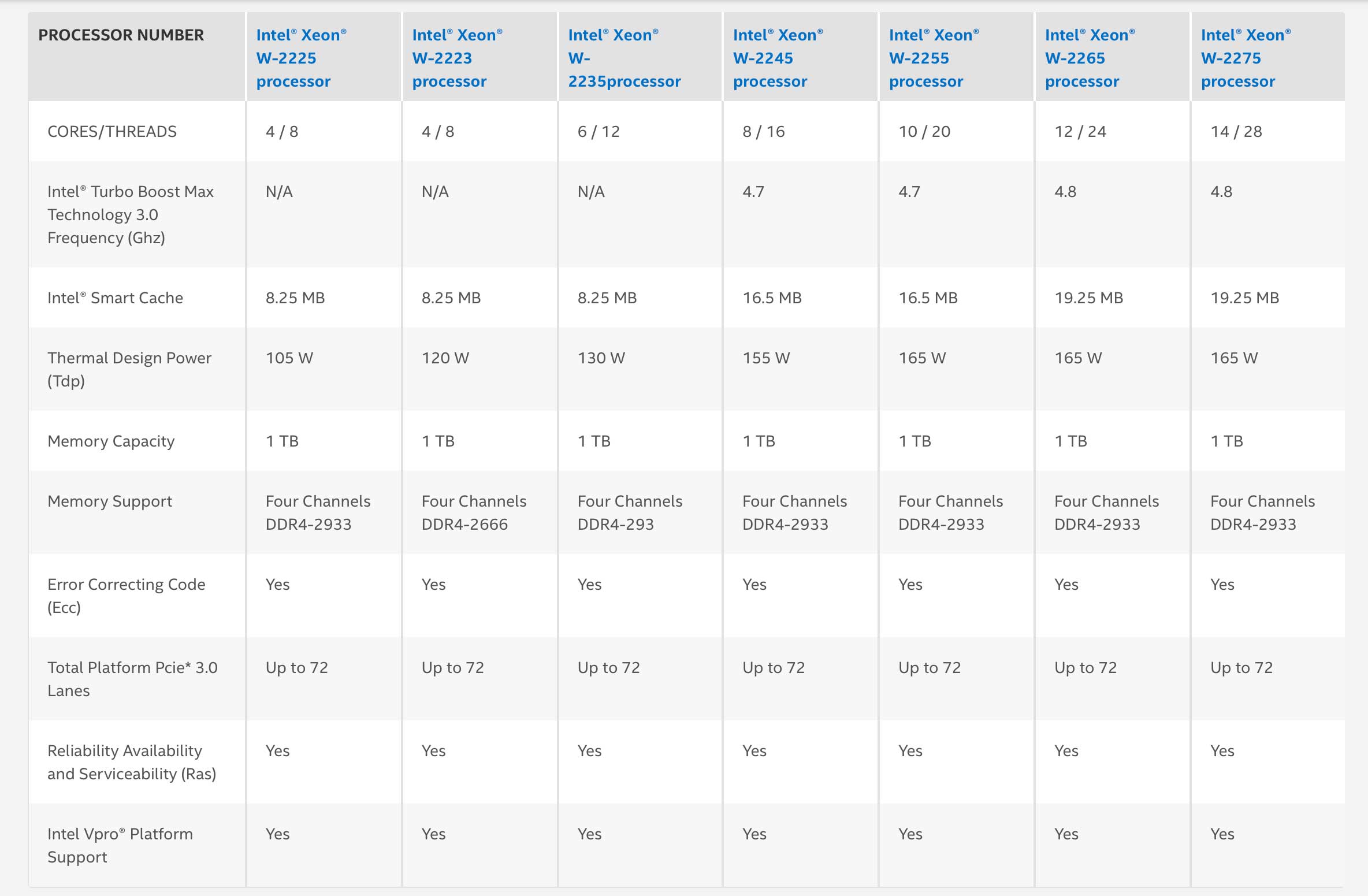I nuovi processori Xeon W-2200 e Core serie X dovrebberro essere disponibili a partire da novembre unitamente a “una nuova struttura di prezzi”. Le CPU sono indicate come adatte “per computer desktop e workstation mainstrem”; sono dotate di funzonalità per l’accelerazione dell’intelligenza artificiale grazie all’integrazione della tecnologia Intel Deep Learning Boost.