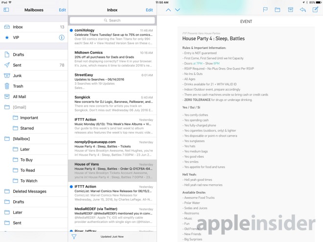 Infatti su iPad Pro 12,9” sia Mail che Note in iOS 10 vengono visualizzate immediatamente con una vista suddivisa in tre pannelli e non nelle tradizionali due colonne a cui siamo abituati da anni con gli iPad più compatti. In Mail è visibile a sinistra l’elenco delle caselle di posta, nel pannello centrale i messaggi email conservati nella cartella selezionata, infine nel terzo e ultimo pannello a destra è mostrato il contenuto del messaggi selezionato. La novità è segnalata da AppleInsider di cui riportiamo le immagini in questo articolo.
