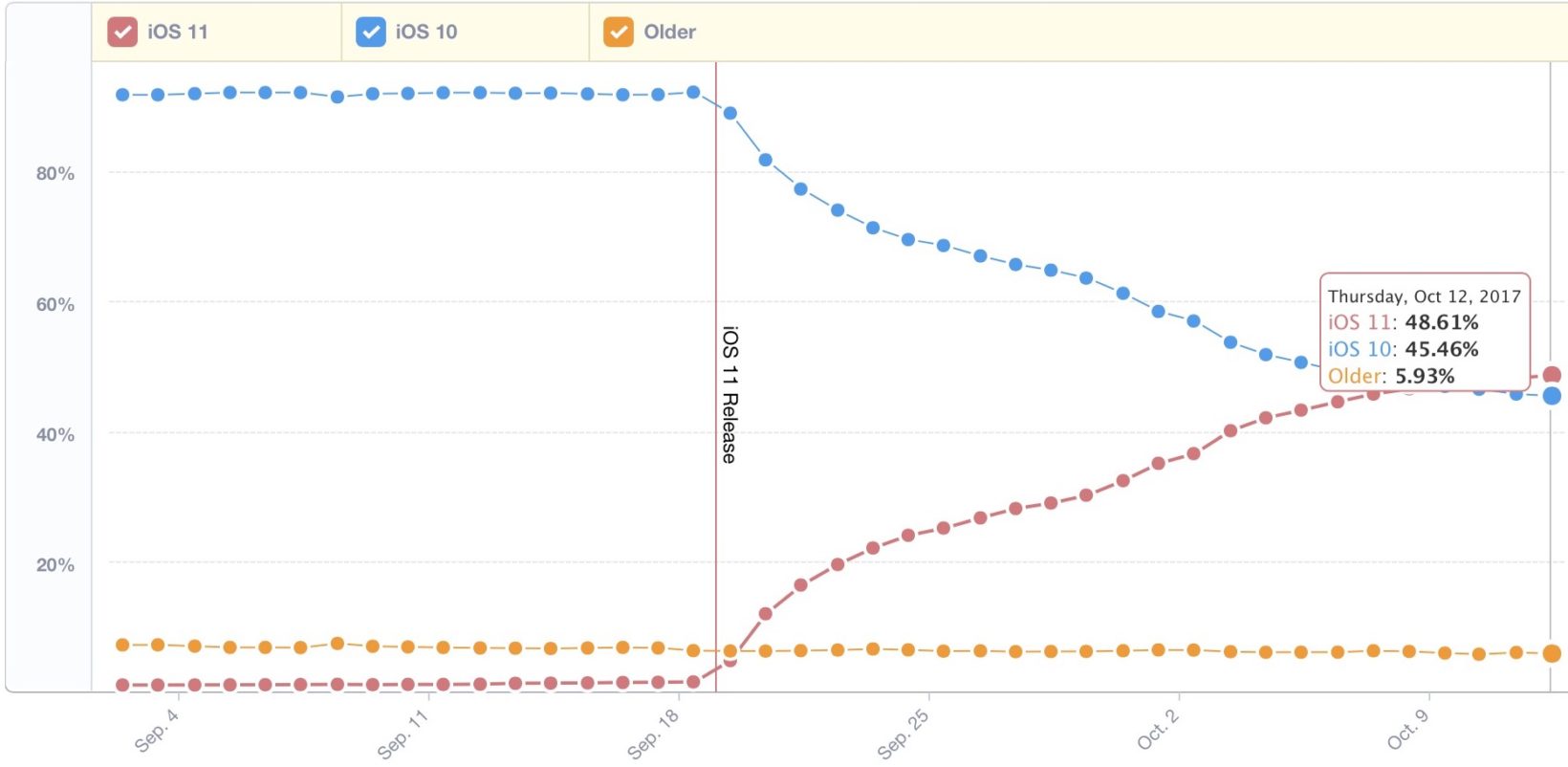 In assenza di dati ufficiali di Cupertino la progressione di iOS 11 è fotografata da società specializzate in analisi del mondo mobile e piattaforme di advertising. Pur non potendo vantare l’accesso diretto ai numeri di App Store, le rilevazioni di terze parti risultano solitamente attendibili perché monitorano il sistema operativo in funzione sulla base delle app che sfruttano strumenti di marketing e pubblicità impiegati all’interno di migliaia di app. Nel momento in cui scriviamo le percentuali di Mixpanel sono state aggiornate e, a sorpresa, mostrano un calo di iOS 11 che ora si attesta al 42% circa, contro il 45% di iOS 10, quindi un passo indietro rispetto al sorpasso ma ormai con una base di installato quasi identica.