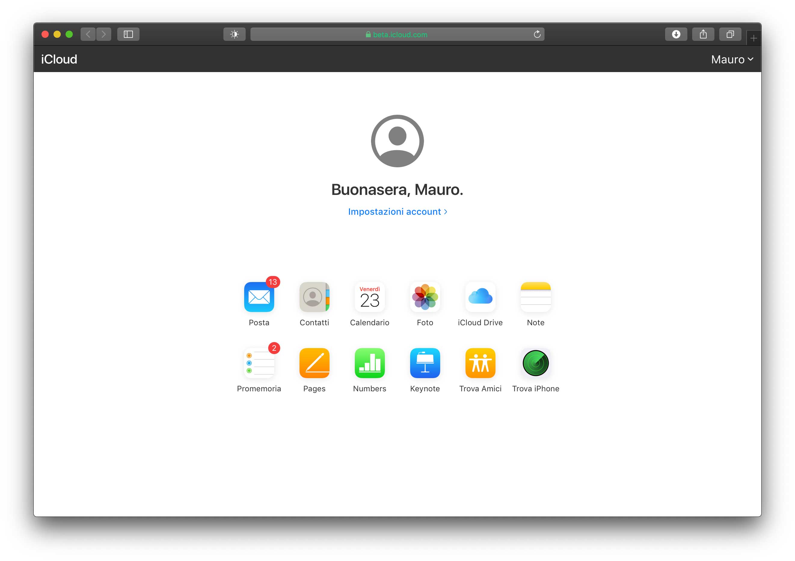 La versione beta del sito dedicato a iCloud ora mostra uno sfondo bianco co icone più piccole e, al posto della voce “Impostazione” ora è presente la voce “impostazioni account”. Le altre sezioni che è possibile richiamare sono identiche a quelle del sito tradizionale dedicato a iCloud, con le sezioni Posta, Contatti, Calendario, Foto, iCloud Drive, Note, Promemoria, Pages, Numbers, Keynote, Trova Amici e Trova iPhone.