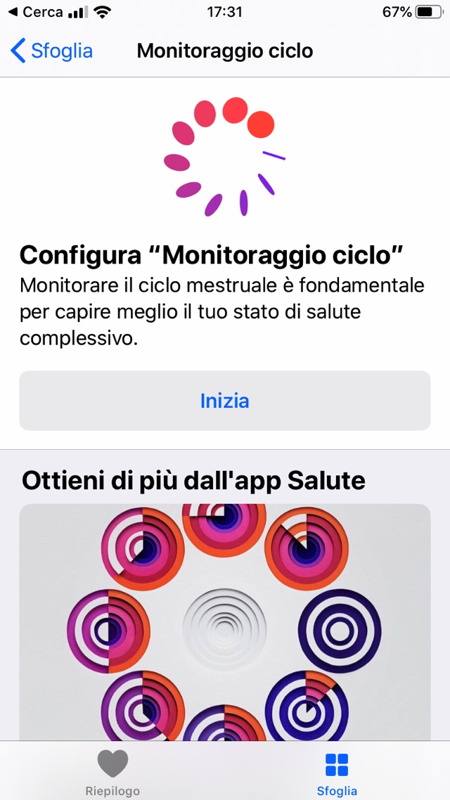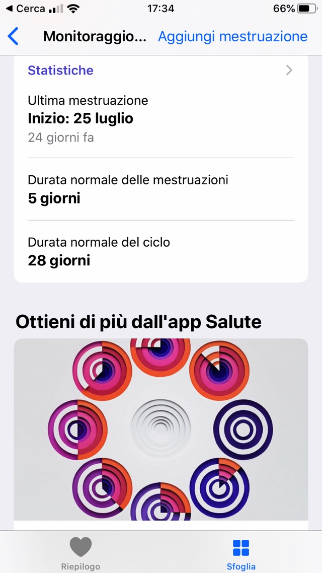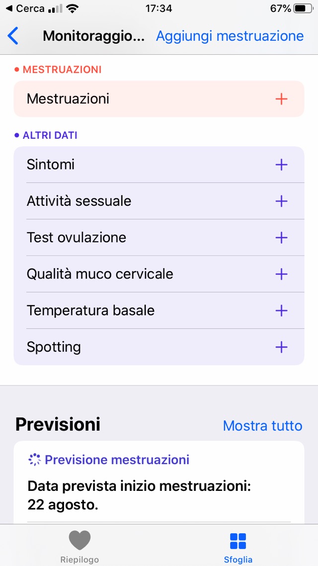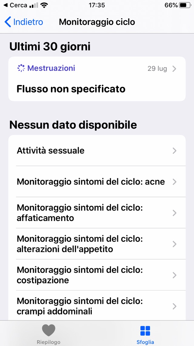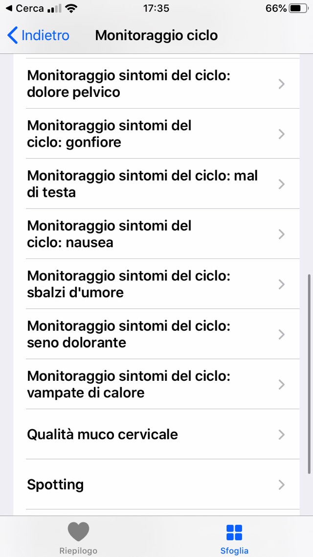Scegliendo, invece, di sfogliare le diverse categorie dell’app, tra cui – accanto ad Apparato respiratorio, Attività, Cuore e Misure corporee – ora compare anche il Monitoraggio Ciclo.