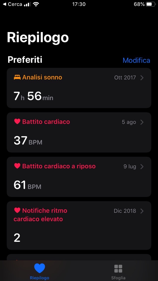 Dopo aver configurato il proprio profilo sanitario, si può accedere al Riepilogo dei propri dati, per avere, con un solo colpo d’occhio una sintesi dell’analisi del sonno e di alcuni dati relativi al proprio battito cardiaco.
