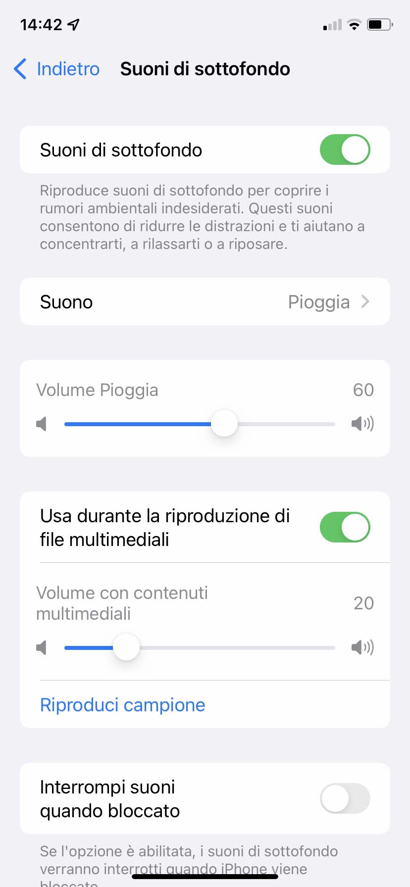 5) Dalle “Impostazioni di sottofondo” potete scegliere il volume del suono, se attivare o no questi suoni durante la riproduzione di file multimediali (si può anche riprodurre un campione di esempio per capire se il risultato è di nostro gradimento) e attivare o no l’opzione “Interrompi suoni quando bloccato” (se l’opzione è abilitata i suoni di sottofondo verranno interrotti quando iPhone viene bloccato).