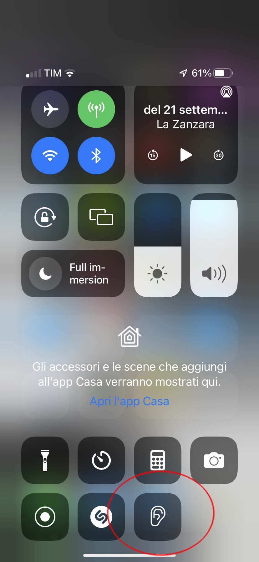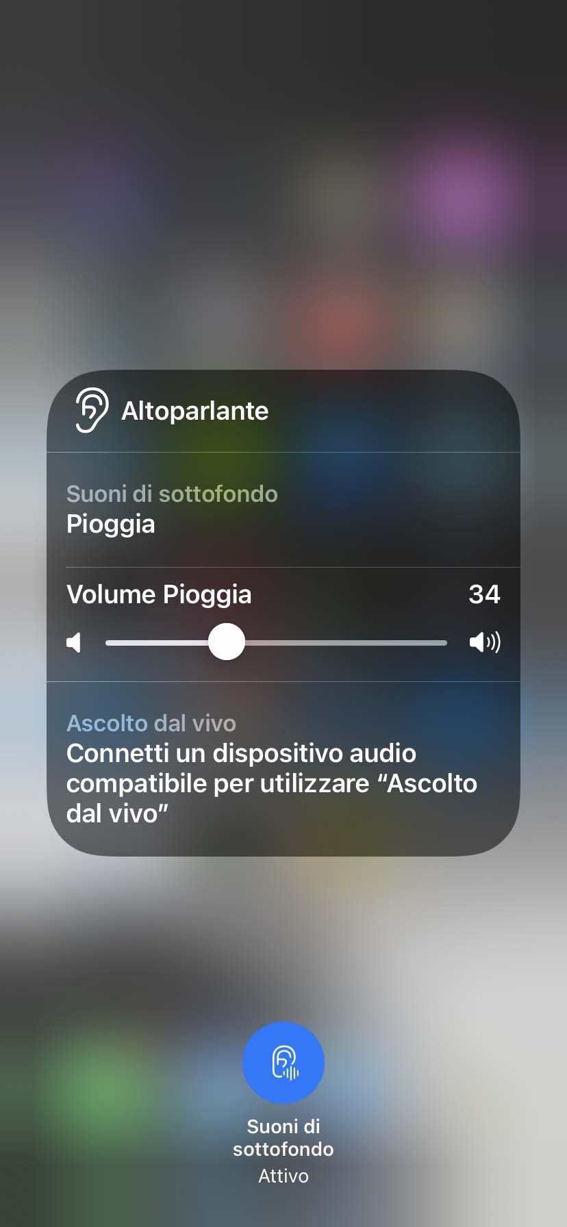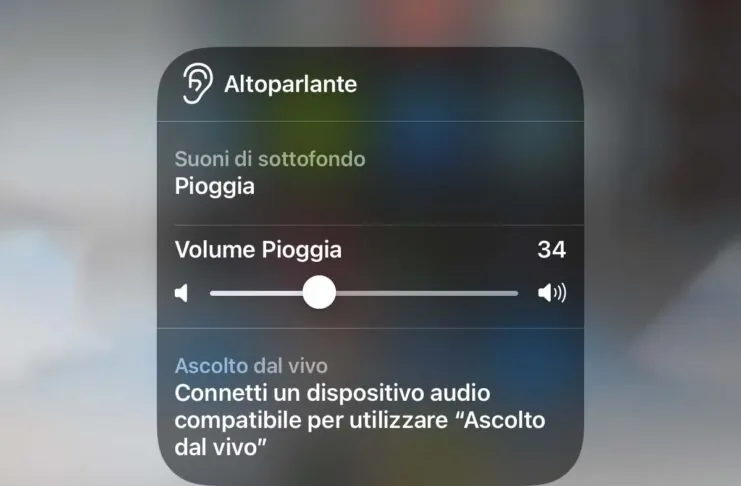 I suoni di sottofondo possono essere richiamati anche dal Centro di Controllo (appare una icona dedicata) scorrendo verso il basso dal bordo superiore destro sui telefoni con Face ID o scorrendo dal basso verso l’alto su tutti gli altri modelli.