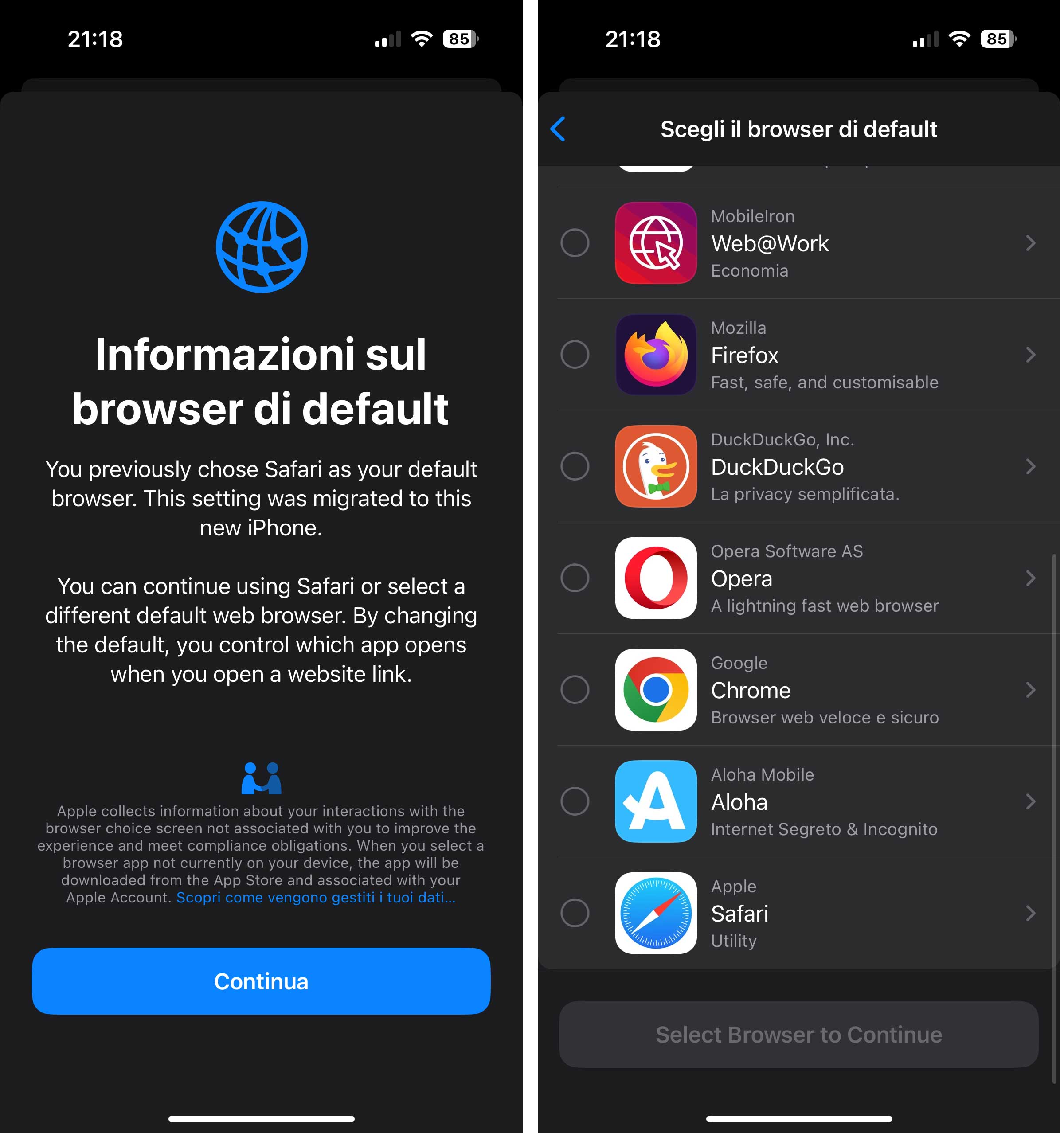 Il primo cambiamento è la possibilità di impostare in modo definitivo il browser direttamente dalla schermata in questione senza bisogno di passare dall’App Store; ora è inoltre necessario scorrere per forza tutta la schermata con le proposte di browser per confermare quello che si vuole usare. Questa decisione dipende dall’Unione europea e non da Apple: l’idea è di non influenzare la scelta dell’utente mostrandogli solo una parte della selezione.