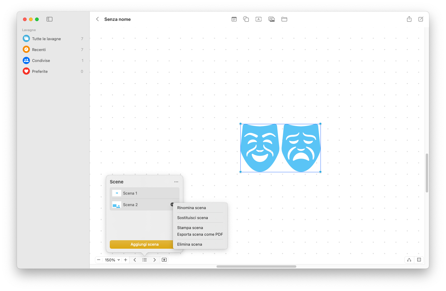 La funzione “Crea scena” permette di presentare le aree salvate della lavagna e passare dall’una all’altra aggiungendole come scene. Un piccolo pulsante dedicato (“”Navigatore scena”) a forma di stella appare nell’angolo inferiore sinistro; facendo click sul pulsante in questione appaiono altre voci, inclusa l’opzione “Aggiungi scena” che permette di mostrare e raggiungere facilmente diverse aree della lavagna. Dopo avere creato una scena, possiamo chiamare al volo la sezione desiderata selezionandola da un semplice elenco. Le scene possono essere rinominate, sostituite, stampate, esportate in PDF ed eliminate.