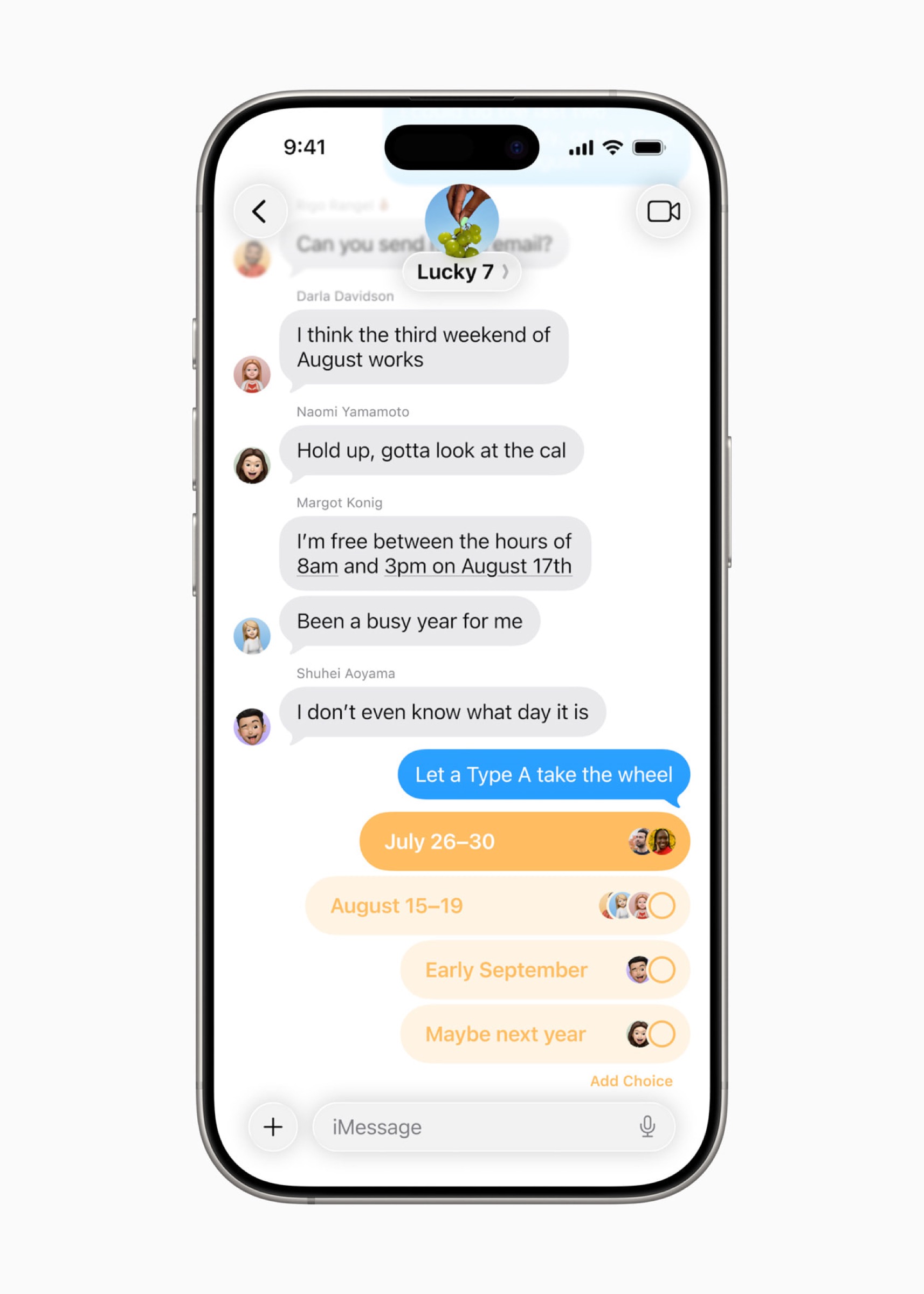 Le conversazioni diventano anche più personalizzabili: gli utenti possono creare sfondi unici con Image Playground e inserire sondaggi direttamente nei messaggi. Con Apple Intelligence, l’app può persino suggerire un sondaggio quando capisce che potrebbe essere utile nel contesto della chat.