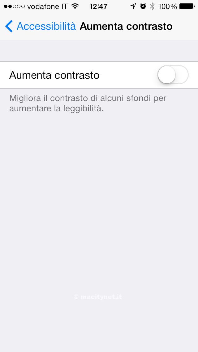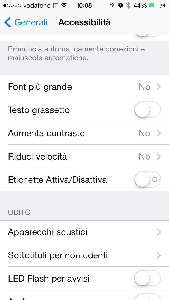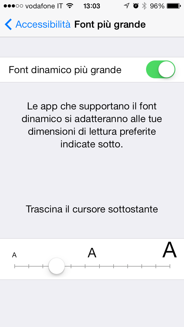 Iniziamo la fotogalleria di iOS 7.1 le novità italiane con uno sguardo all’interfaccia facilitata. In Impostazioni > Generali > Accessibilità, nella funzione Testo più grande l’interruttore denominato Font dinamico più grande prende il nome di Dimensioni maggiori; la funzione Testo grassetto ora attiva la caratteristica associata anche alla tastiera di sistema, alle icone delle applicazioni ed alla calcolatrice di sistema.