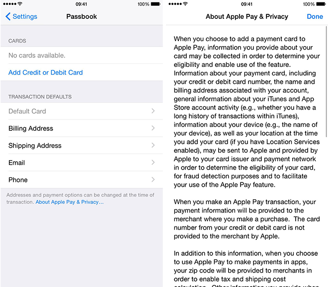 Infine in iOS 8.1 beta Apple ha integrato, come annunciato fin dal Keynote, i comandi e i menu per gestire Apple Pay. Il nuovo sistema di pagamenti di Apple verrà gestito all’interno di Passbook: qui l’utente potrà inserire e rimuovere carte di credito e debito, l’indirizzo di fatturazione e quello per la spedizione dei beni e tutti gli altri dati utili o necessari per gestire i pagamenti e anche le funzioni di sicurezza associate. Per esempio quando i Servizi di Localizzazione di iPhone o iPad sono attivi, il sistema rileverà la posizione dell’utente al momento dell’attivazione di Apple Pay per le procedure di verifica e anti-frode.
