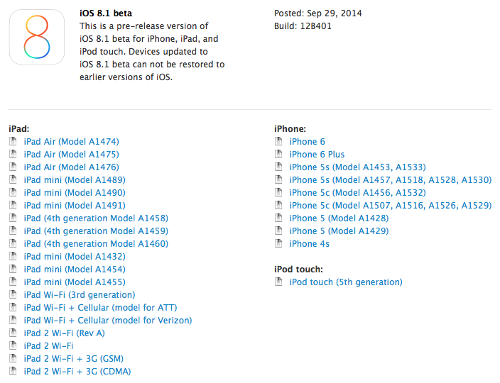 Apple ha rilasciato agli sviluppatori la prima beta dell’update che porta iOS alla release 8.1. La build è numerata 12B401 e arriva pochi giorni dopo il rilascio di iOS 8.02. Sempre per i soli sviluppatori è disponibile anche un update per l’Apple TV e Xcode 6.1 beta 3.