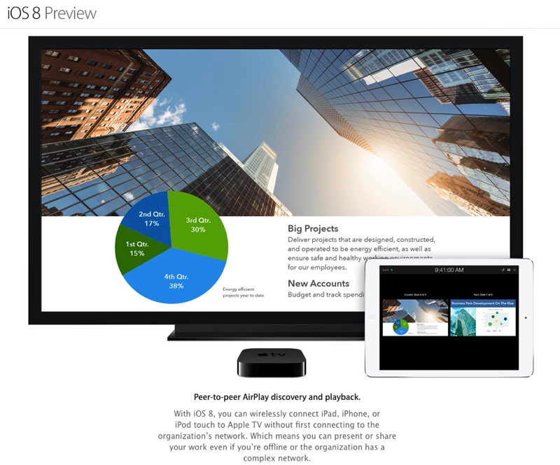Grazie a iOS 8 e AirPlay sarà possibile collegare iPhone e iPad a una Apple TV anche quando non è disponibile una rete Wi-Fi. Anche questa funzione non è stata presentata da Apple durante il Keynote che, per ragioni di tempo, ha costretto i dirigenti della Mela ad attenersi alle novità principali. Questa nuova funzione di iOS 8 e AirPlay è descritta in modo sintetico da Apple nella pagina dedicata alle nuove funzioni di iOS 8 in azienda di cui abbiamo parlato più estesamente in questo articolo. La funzione è denominata Peer-to-peer AiPlay discovery and playback, sottolineando così il collegamento diretto tra iPhone e iPad con Apple TV senza dover passare attraverso una rete Wi-Fi.