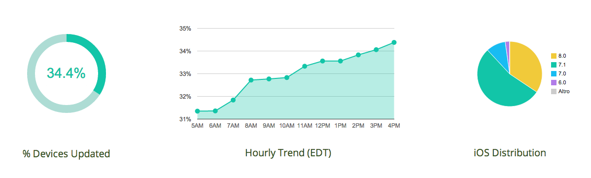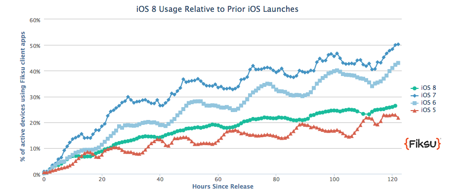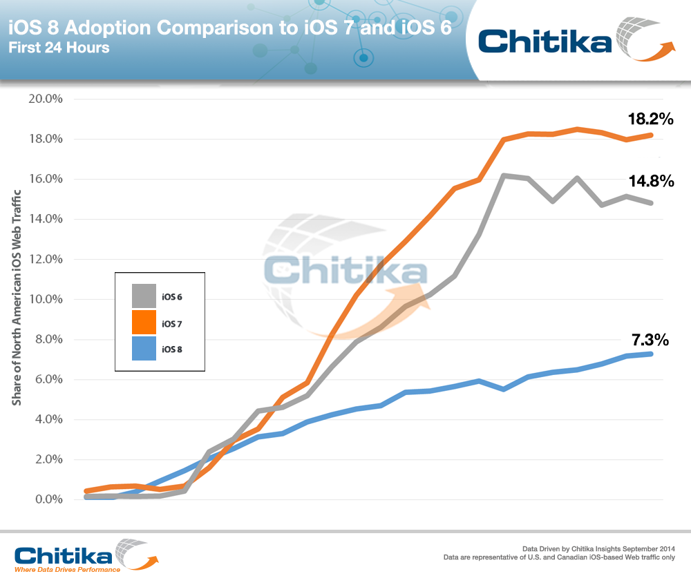 Chitika aveva già evidenziato una partenza più debole di iOS 8 rispetto ai predecessori, che nelle prime 24 ore dal rilascio aveva raggiunto solo il 7.2% dei dispositivi nordamericani, mentre mentre iOS 7 e iOS 6 avevano rispettivamente raggiunto il 18.2% e il 14.8%.