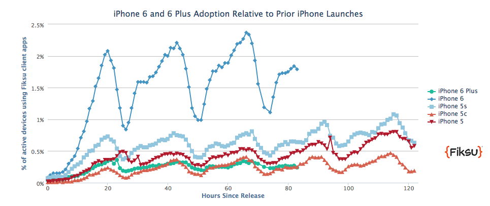 Qualche dato emerge anche dall’adozione dei nuovi iPhone: il più acquistato sembra essere nettamente iPhone 6, mentre iPhone 6 Plus sembra aver lo stesso ritmo di adozione di iPhone 5C, inferiore dunque a quello di iPhone 5 e 5S.
