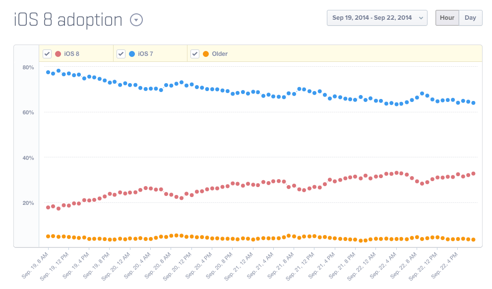 Il tasso di adozione di iOS 8, a parità di tempi, continua ad essere sotto quello di iOS 7, ma grazie ad iPhone 6 le sue quote di mercato crescono. Questo quel che dicono i dati che arrivano da diversi siti di mobile analytics, fra cui Chtika, Fiksu, Mixpanel e AppSee, che concordano tutti grossomodo sulle cifre, alcun anche in tempo reale.