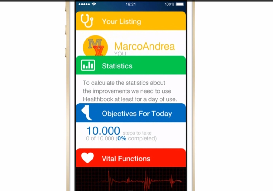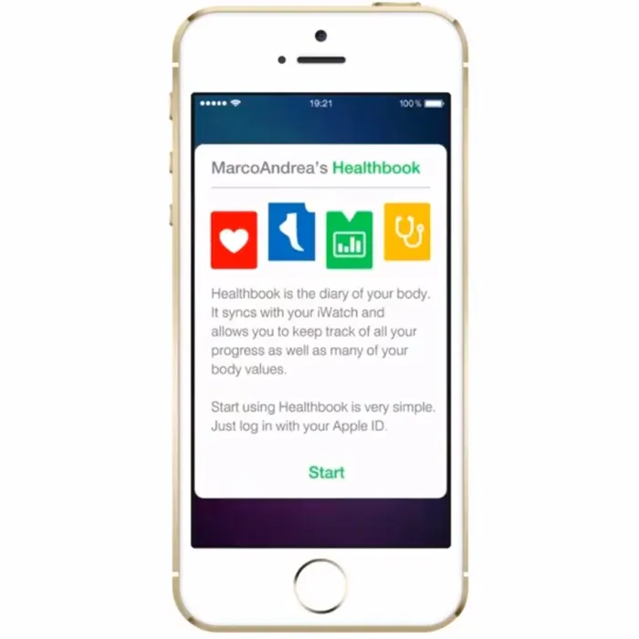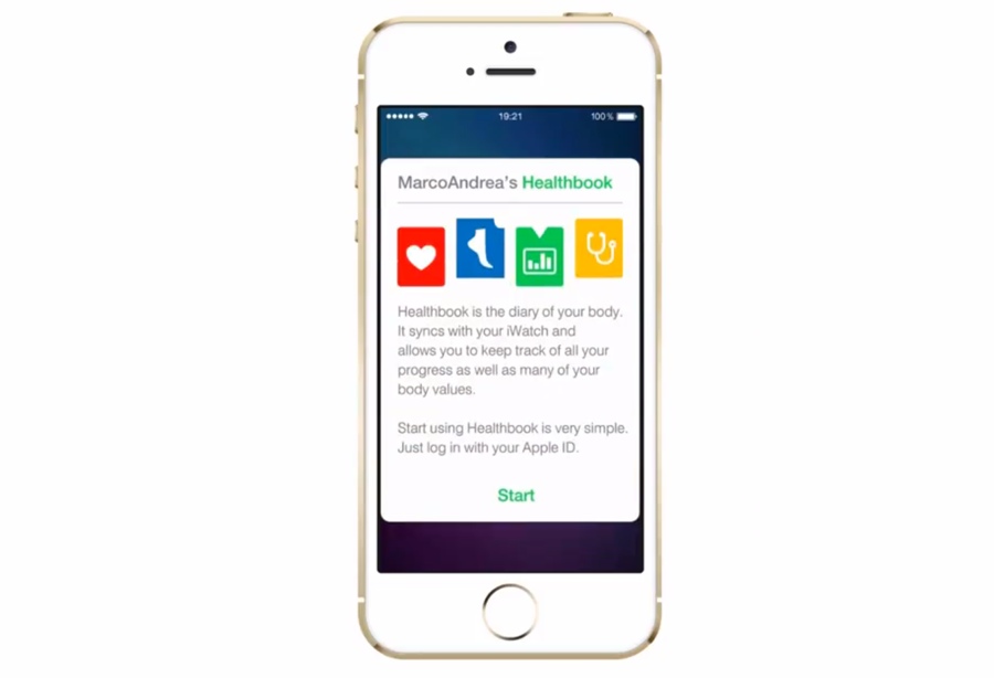 In questo concept ben realizzato Healthbook è immaginato come app che sincronizza con iPhone i dati rilevati dai vari sensori che si preume saranno integrati in iWatch. Oltre a monitorare i dati vitali e le statistiche principali, Healthbook è immaginata qui come app in grado di svolgere anche le funzioni di personal trainer.