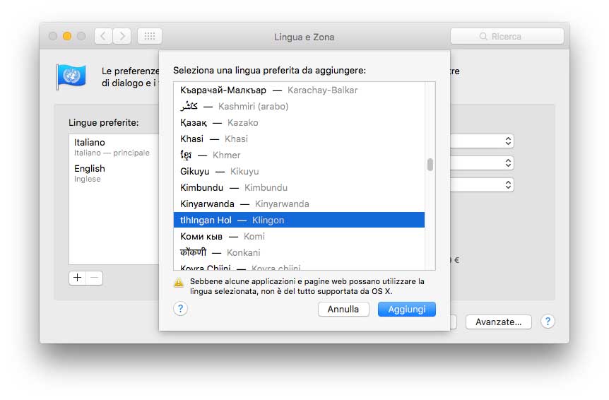 Lo scorso anno, con l’arrivo di OS X 10.10 Yosemite, Apple aveva inserito nelle Preferenze di Sistema la possibilità di scegliere anche il siciliano e il napoletano. OS X da tempo supporta di serie varie lingue permettendo di scegliere tra decine e decine d’idiomi diversi: inglese, francese, tedesco, spagnolo, coreano e molti altri. Tocca ovviamente agli sviluppatori decidere se supportare o no tali lingue, integrando stringhe specifiche nei software. Se un’applicazione supporta la lingua principale scelta dall’utente, viene utilizzata tale lingua. In caso contrario, vengono utilizzate le altre, nell’ordine indicato nelle preferenze. Se OS X o un’applicazione supporta la lingua principale, i menu e i messaggi vengono mostrati in tale lingua. In caso contrario, viene utilizzata la seconda lingua dell’elenco, e così via.