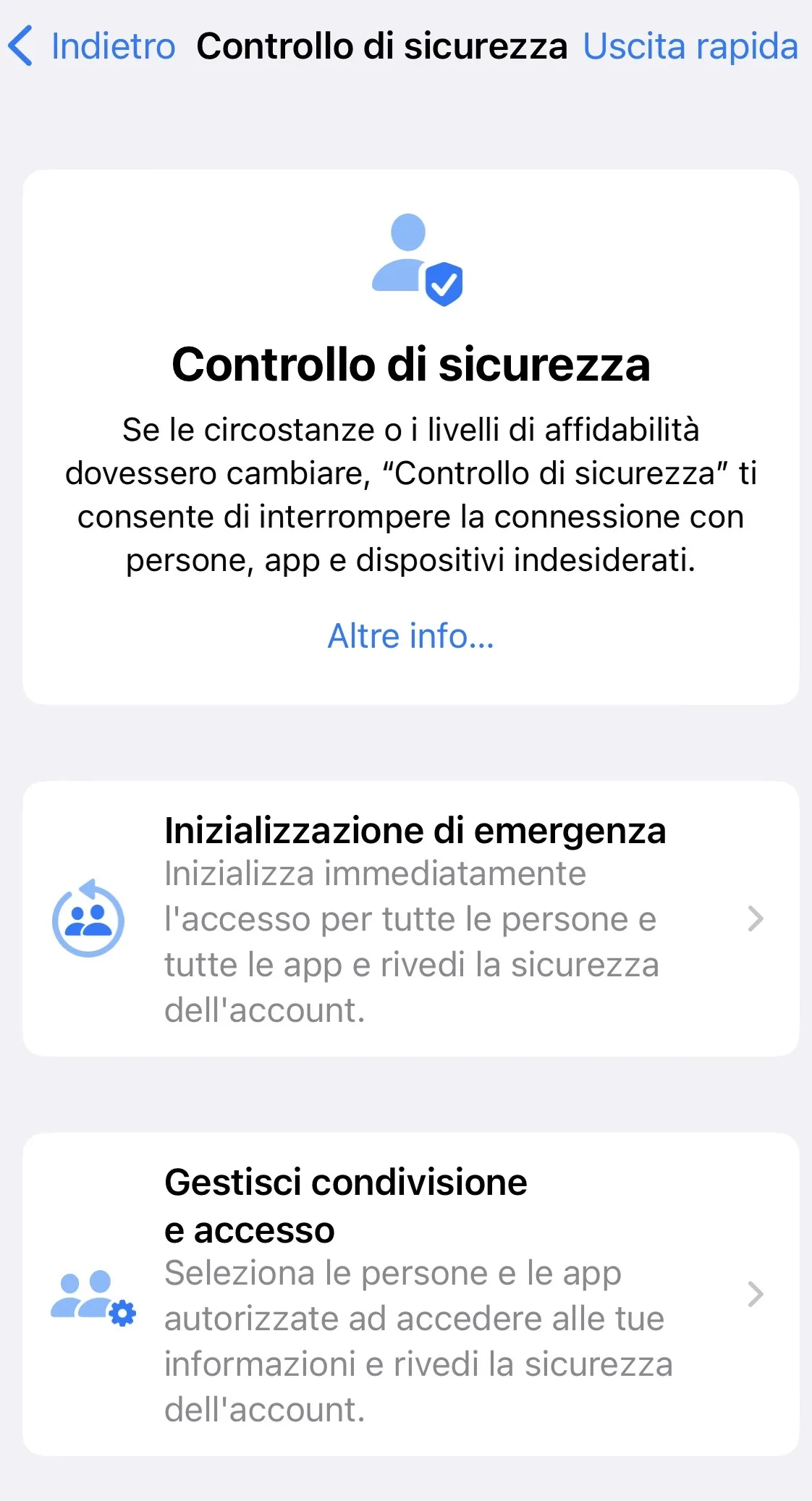 Una seconda funzione di Controllo Sicurezza (che si trova nel pannello Privacy e Sicurezza –> Controllo di Sicurezza di iOS 16) consente anche di inizializzare in emergenza il telefono al fine di proteggere rapidamente le informazioni dalle persone e dalle app, modificare la password dell’ID Apple e rivedere i contatti di emergenza.