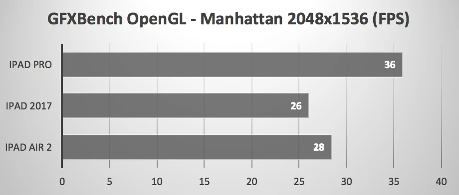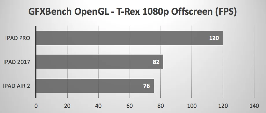 Il test GFXBENCH “OpenGL T-Rex” selezionando la modalità 1080p evidenzia 120 frame al secondo con l’iPad Pro, che scendono a 82 fps con l’iPad 2017 e 76 frame al secondo con iPad Air 2. Il test GFXBENCH “OpenGL Manhattan” a 2.048 x 1.536 pixel mostra 36 fps con l’iPad Pro, 26 fps con l’iPad 2017 e 28 fps con l’iPad Air 2. Con i test JetStream per misurare le prestazioni JavaScript con le applicazioni web è stato ottenuto un punteggio di 152 con l’iPad Pro, di 124 con l’iPad 2017 e di 84 con l’iPad Air 2.