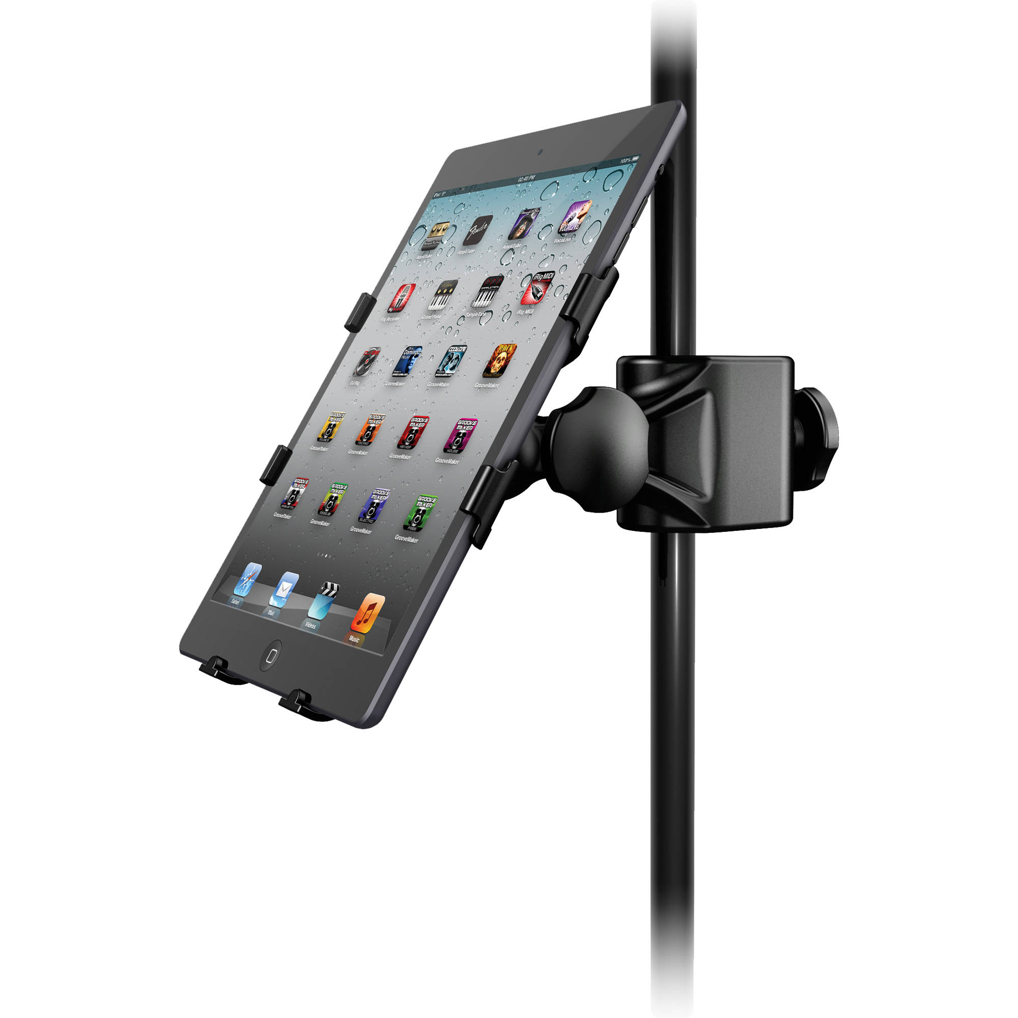 Si tratta sostanzialmente di un supporto universale che permette di fissare iPad all’asta di sostegno dei microfoni, sia quelli che poggiano a terra sia quelli più corti posizionabili su tastiera e pianoforte. Sostiene il tablet della Mela sia in posizione verticale, sia in orizzontale trasformandolo in un vero e proprio leggio elettronico.