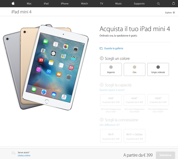 Il nuovo iPad mini 4 è già disponibile su Apple Store online a partire da 399 euro per il modello da 16 GB solo Wi, oppure da 519 euro per la versione da 16 GB Wi-Fi + Cellular.