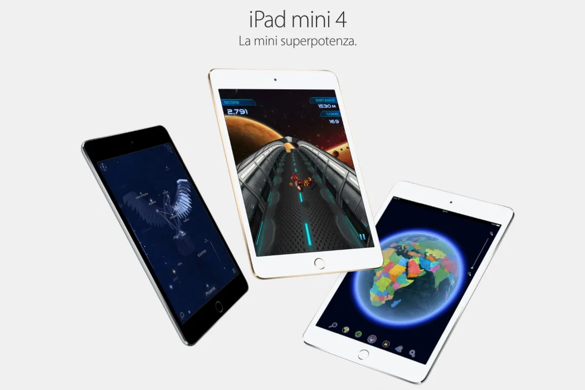 Il nuovo iPad mini 4 è già disponibile su Apple Store online in Italia a partire da 399 euro. La presentazione è avvenuta in sordina: i dirigenti Apple lo hanno solo menzionato nel Keynote dichiarando che si tratta di un iPad Air 2 concentrato nello chassis di un iPad mini. Anche a livello estetico ci sono novità: Apple dichiara che è il 18% più sottile, lo spessore è infatti di 6,1 mm mentre il peso è di 299 grammi: i modelli precedenti sono spessi 7,5 mm e il peso era di 330 o 341 grammi rispettivamente per la versione Wi-Fi e Wi-Fi + Cellular.