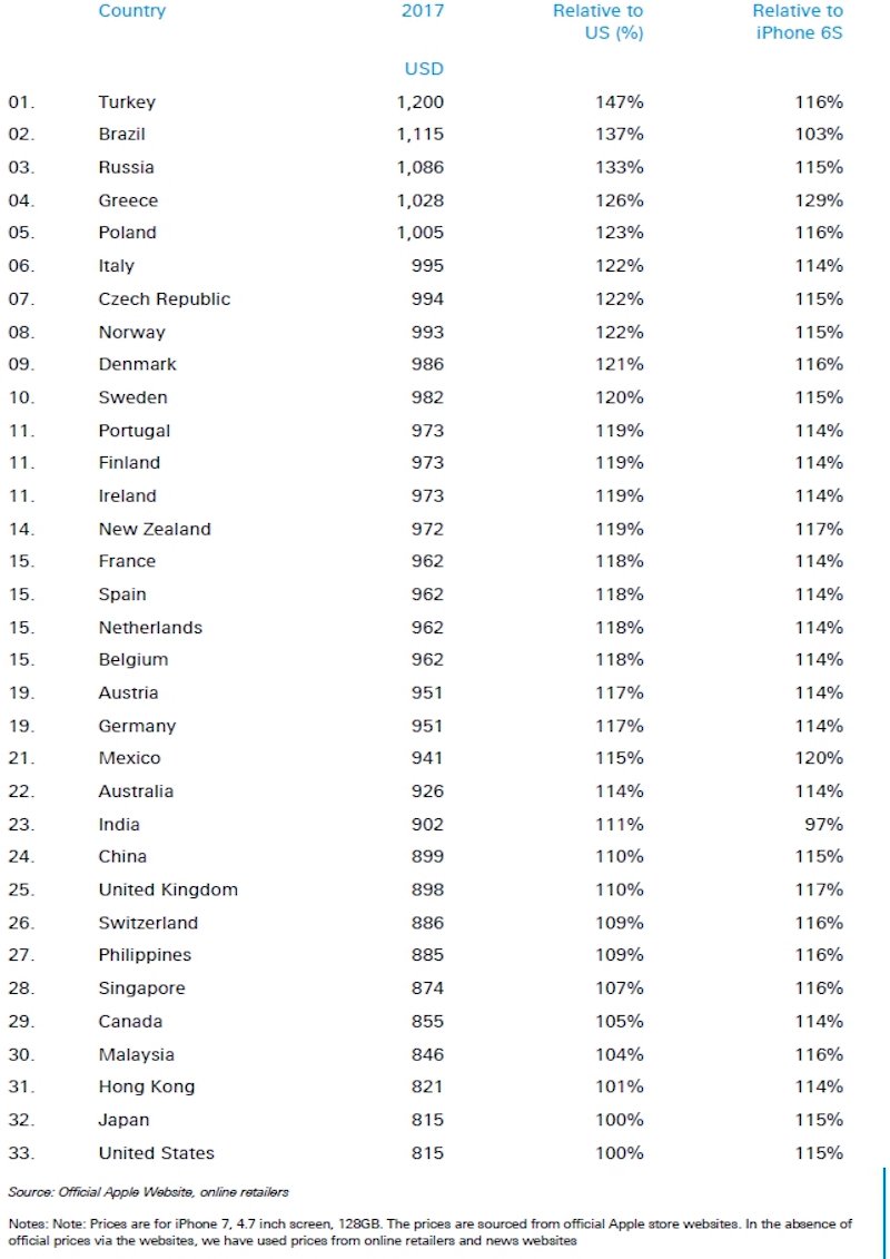 Il prezzo di iPhone 7 nella nazione più occidentale del continente asiatico è del 147% superiore rispetto al prezzo pagato negli Stati Uniti: 1200$ contro 815$ per la versione da 128GB. In data odierna, con il tasso di cambio del 3.55 della lira turca, un iPhone 7 da 128GB in Turchia costa 1210$. Non sorprende sapere che un dispositivo di questo tipo costa meno negli Stati Uniti e anche in Giappone.