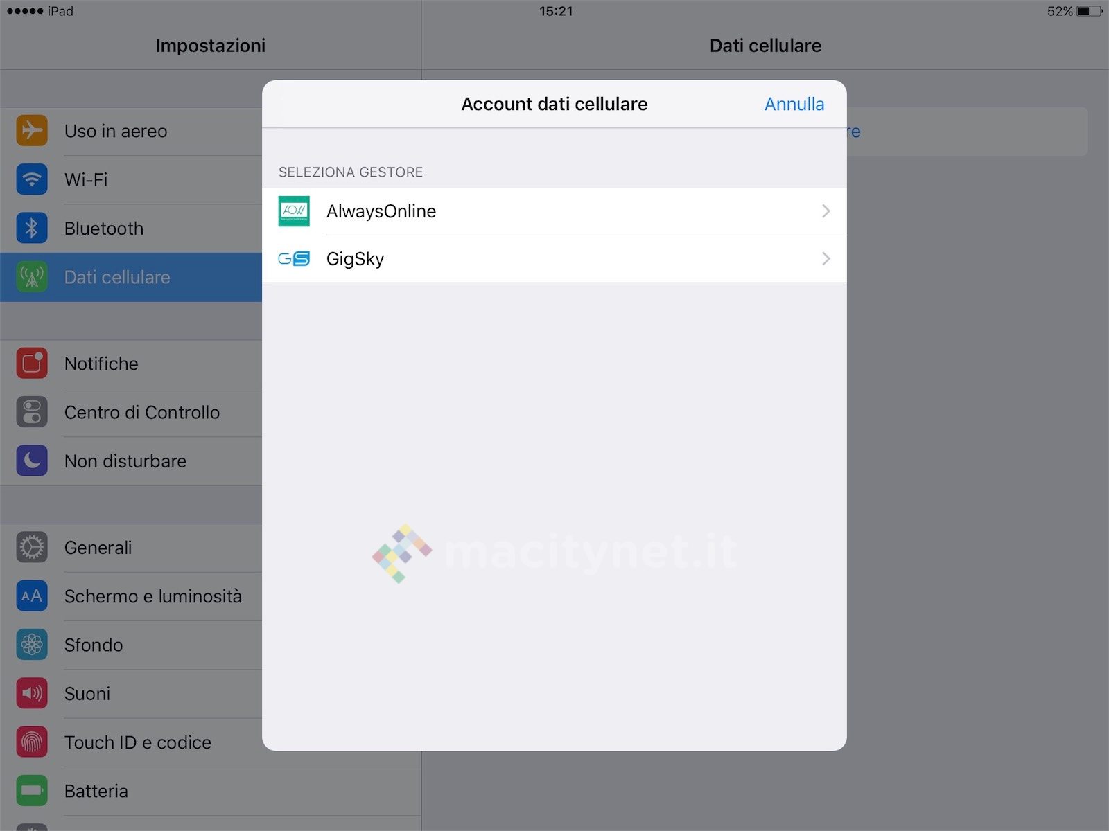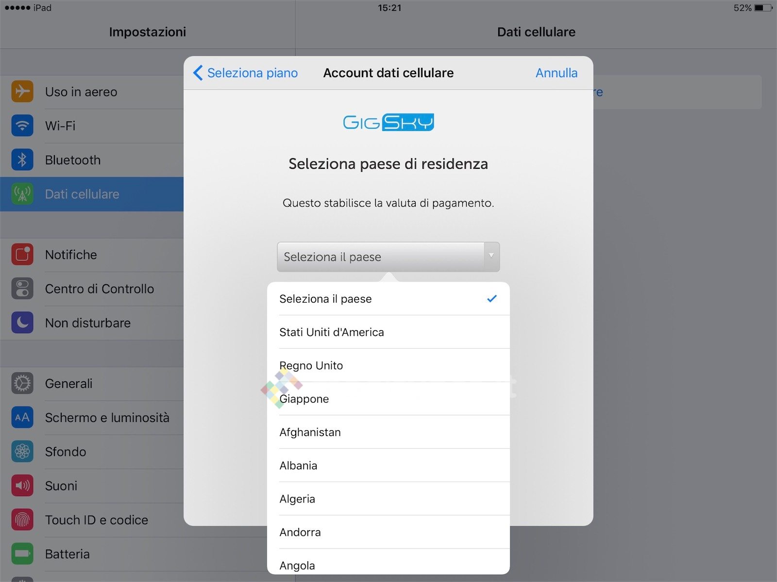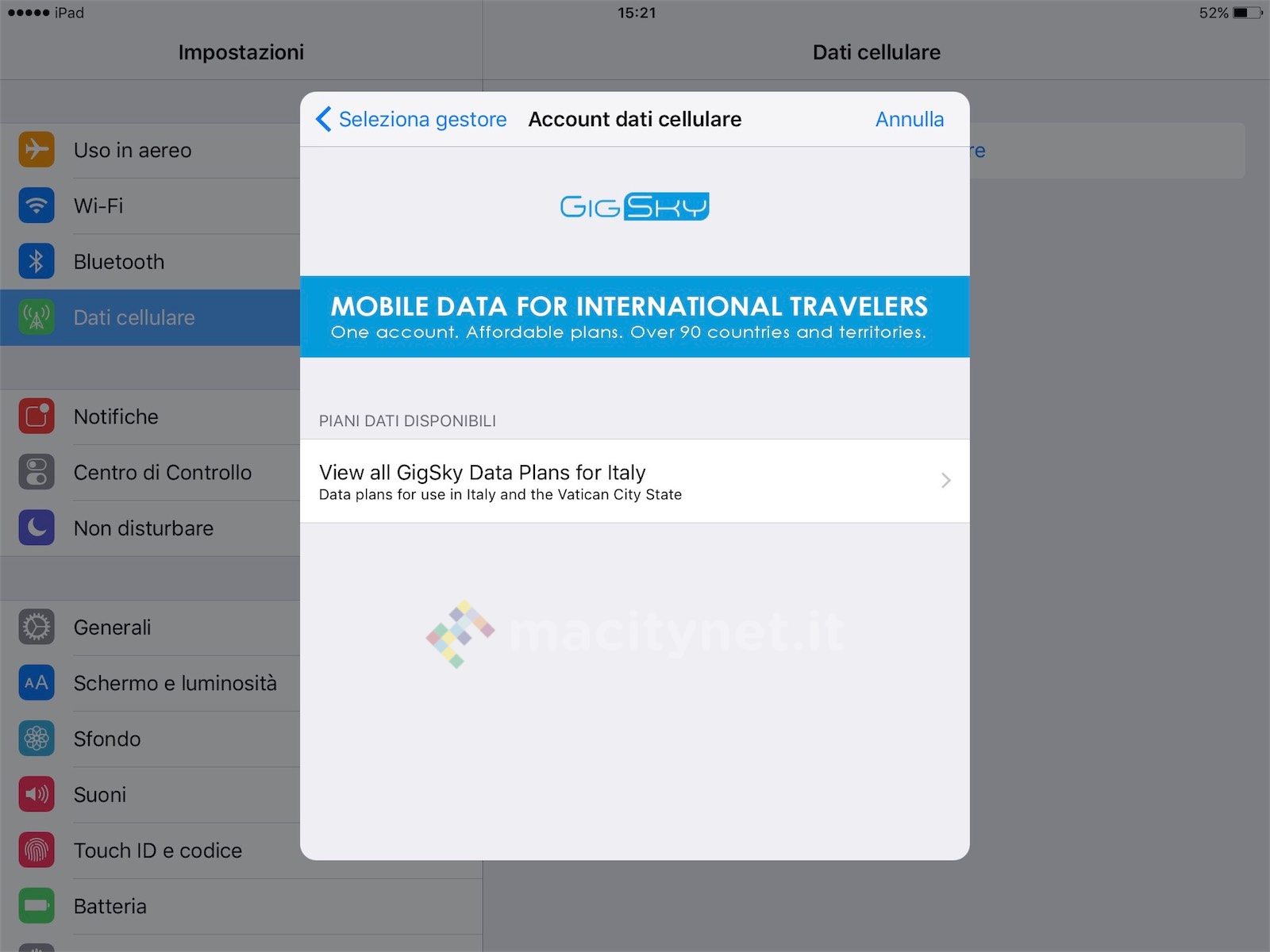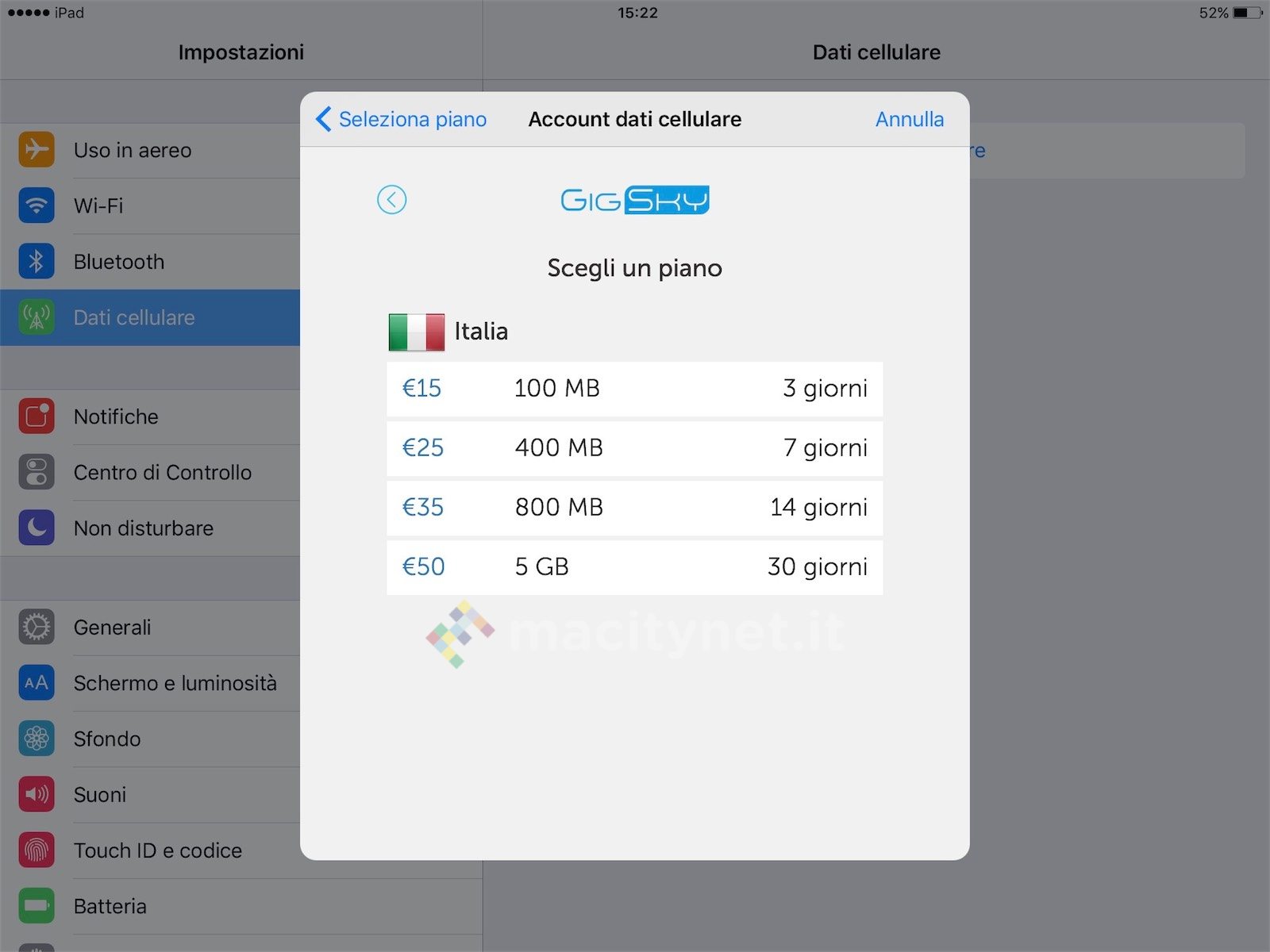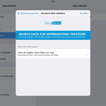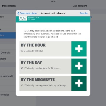 Tenendo presente che la Apple SIM digitale è pensata esclusivamente per l’accesso web all’estero abbiamo modificato Zona e area geografica nelle impostazioni, impostandola su Regno Unito: in un istante la connessione è riuscita, presentando il menu con due operatori mobile virtuali: AlwaysOnline e GigSky. Sono questi gli operatori mobili virtuali che il chip integrato che fa la funzione di SIM, legge e che offrono diversi piani che si adattano alle esigenze di chi viaggia per svago o lavoro, con proposte in base ai MB di traffico dal prezzo abbordabile, oppure in pacchetti per ore, giorni, settimane fino a un mese.