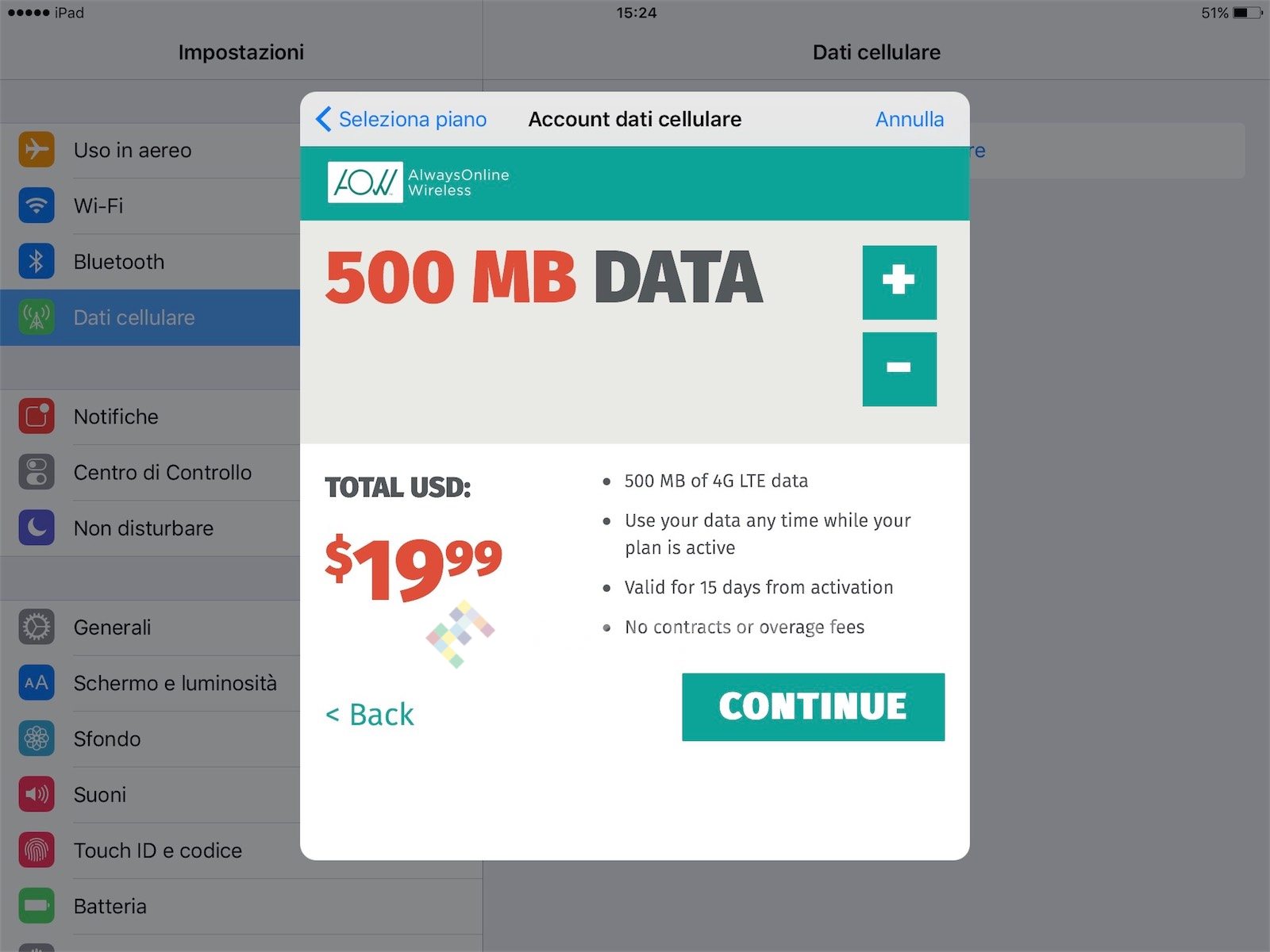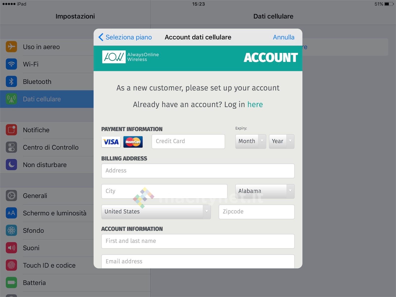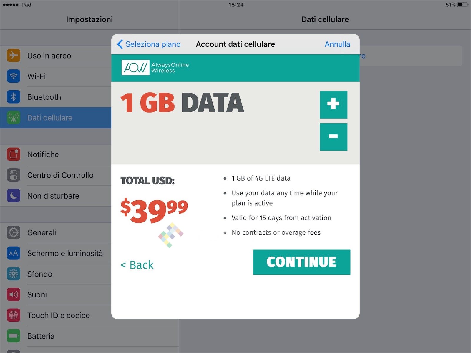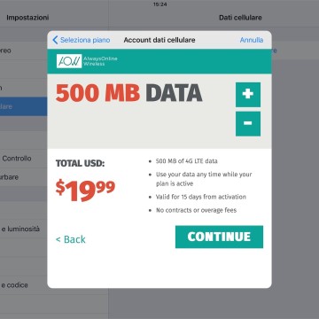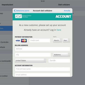 I lettori possono trovare vari esempi delle tariffe e dei piani proposti nella fotogalleria che inseriamo in calce in questo articolo. Pur sapendo che la Apple SIM digitale del nuovo iPad Pro 9,7” è predisposta esclusivamente per chi si trova all’estero (del resto in Italia sono certamente più convenienti i piani degli operatori mobili “reali”), abbiamo provato comunque ad acquistare 1 ora di accesso per un massimo di 20 MB a 0,99 dollari. Al contrario di quanto alcuni potrebbero inizialmente ipotizzare addebito, tariffazione e soprattutto il pagamento sono completamente separati dall’Apple ID dell’utente di iPad. Sia per AlwaysOnline che per GigSky una volta scelto il piano desiderato occorre compilare il form con i dati personali e inserire gli estremi della propria carta di credito, questo naturalmente per chi non ha già creato in precedenza un account con queste due società.